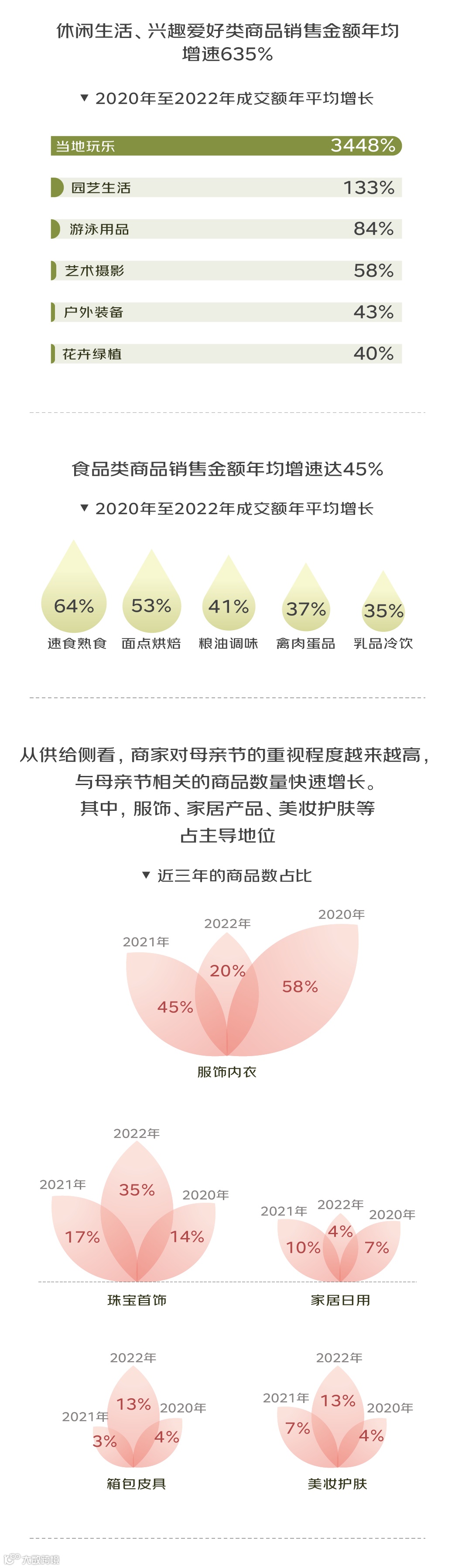 此外,服务和兴趣品类的热销也值得关注。2020年至2022年母亲节前,本地休闲娱乐品类成交额年均增长34倍,园艺品类成交额年均增长133%,游泳用品、艺术摄影类商品成交额年均增长超50%。这类消费的快速增长,体现出消费者愈加重视在精神层面、个性爱好等方面的需求,也代表着母亲群体的消费升级。