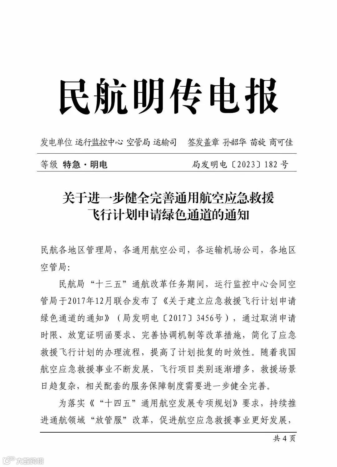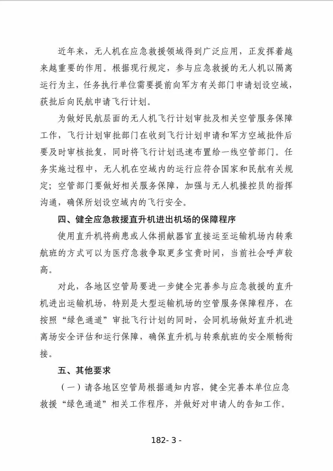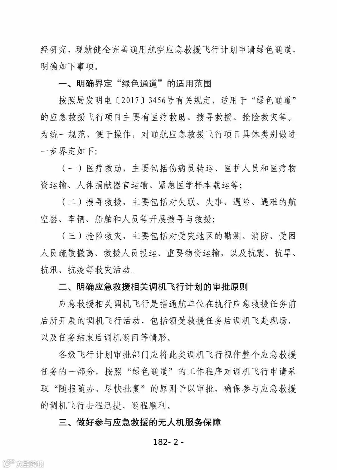 1月29日,民航局运行监控中心、空管局、运输司发布《关于进一步健全完善通用航空应急救援飞行计划申请绿色通道的通知》,进一步明确界定“绿色通道”的适用范围、应急救援相关调机飞行计划的审批原则,并强调要做好参与应急救援的无人机服务保障、健全应急救援直升机进出运输机场特别是大型运输机场的空管服务保障程序。