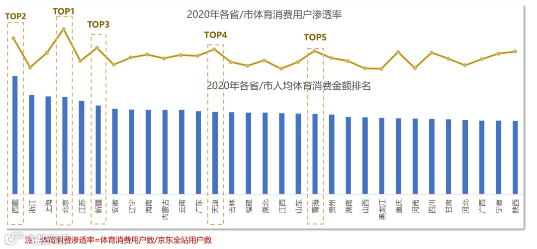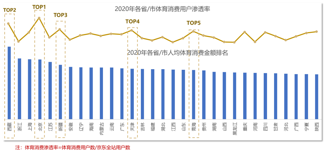 从人均体育消费金额来看,西藏、浙江和上海的消费能力最强。从体育消费的渗透率来看,北京、西藏、新疆、天津和青海的全民健身氛围最浓。