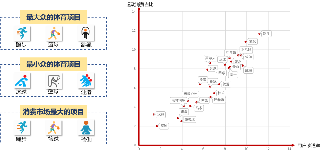 京东大数据显示,最大众的体育项目是跑步、篮球和跳绳;消费市场最大的体育项目是跑步篮球和瑜伽。这意味着,运动渗透率越高,该项运动的消费金额也就越高,因此群众基础是体育消费的关键。