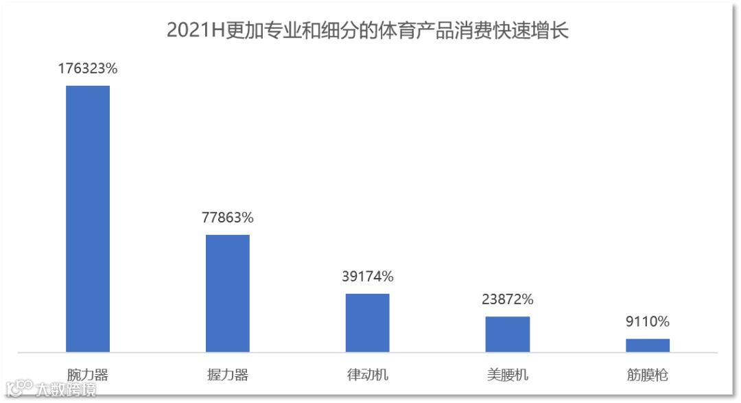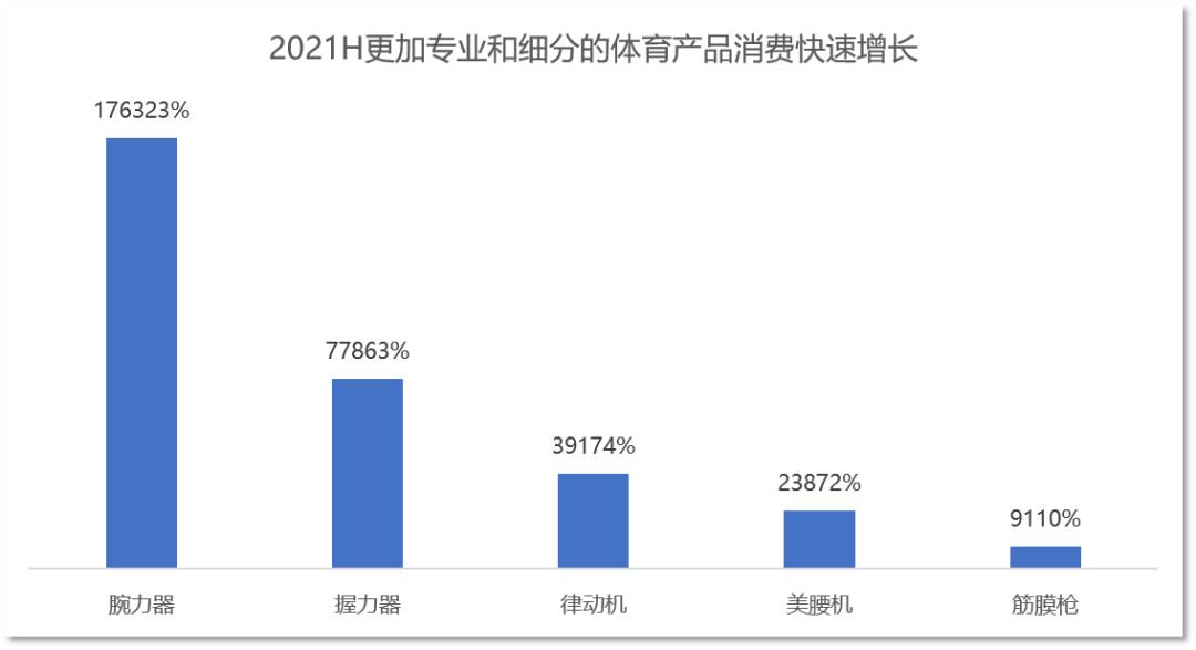 近年来,大众对基础体育消费品类的需求,明显的向更加细分和更加专业的领域扩展,一些新型的体育健身用品成为热销的品类,如腕力器、握力器、律动机等在2021年上半年都实现了爆发增长。而大量细分类目的体育项目中,品类不断丰富,例如训练、防护、恢复等等,消费者更加细分和专业的需求,也为相关企业提供了明确商机。