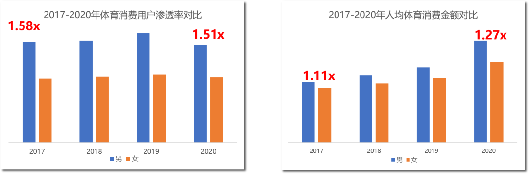 从人均体育消费金额来看,男性用户也显著高于女性用户,并且差距在逐年提升,从2017年的1.11倍,提升到2020年的1.27倍,总体而言,男性更舍得为自己的体育爱好花钱。