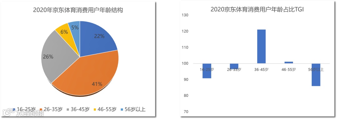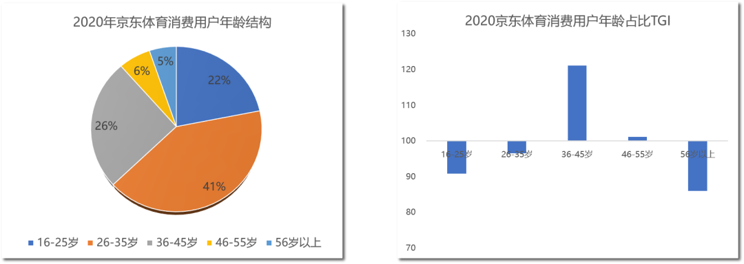 与京东主站的用户结构相比,36-45岁群体的体育消费渗透率最高,显著高于其他年龄段,而一老一小群体的渗透率仍有较大提升空间。