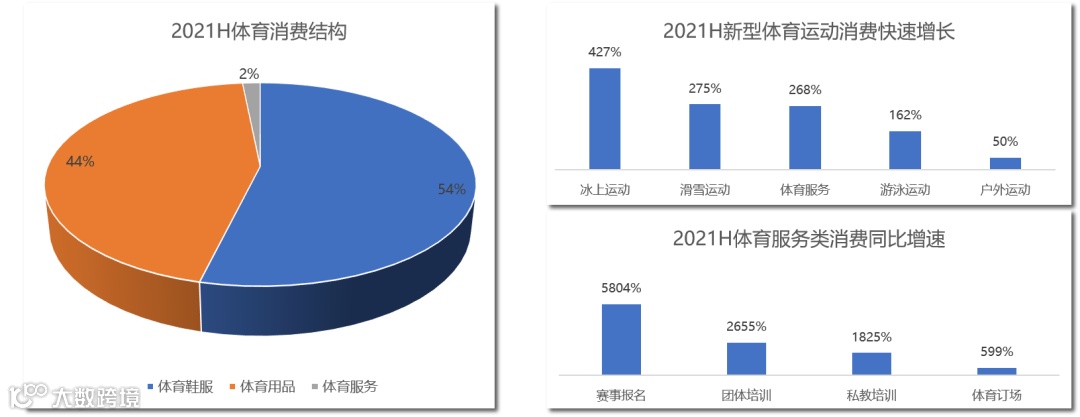 尽管目前,体育服装、鞋帽以及运动器材和器械等实物仍然是消费的绝对主体,而体育服务消费占比仍非常有限。但是,体育消费的结构正在不断优化,一是,消费者对于新型体育运动的消费需求增强。2021年上半年,消费金额增长最快的运动是冰上、滑雪和游泳、和户外运动,二是,以各类体育培训、赛事报名和场馆预定等为代表的体育服务消费也增长迅猛。