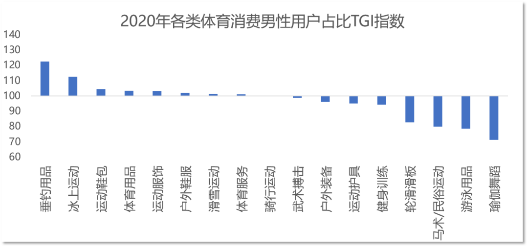 从体育消费的各细分品类来看,男性用户更偏爱垂钓、冰上运动和滑雪,这些品类的男性用户占比都显著高于女性,而女性用户更喜欢瑜伽、游泳、马术、轮滑等运动。