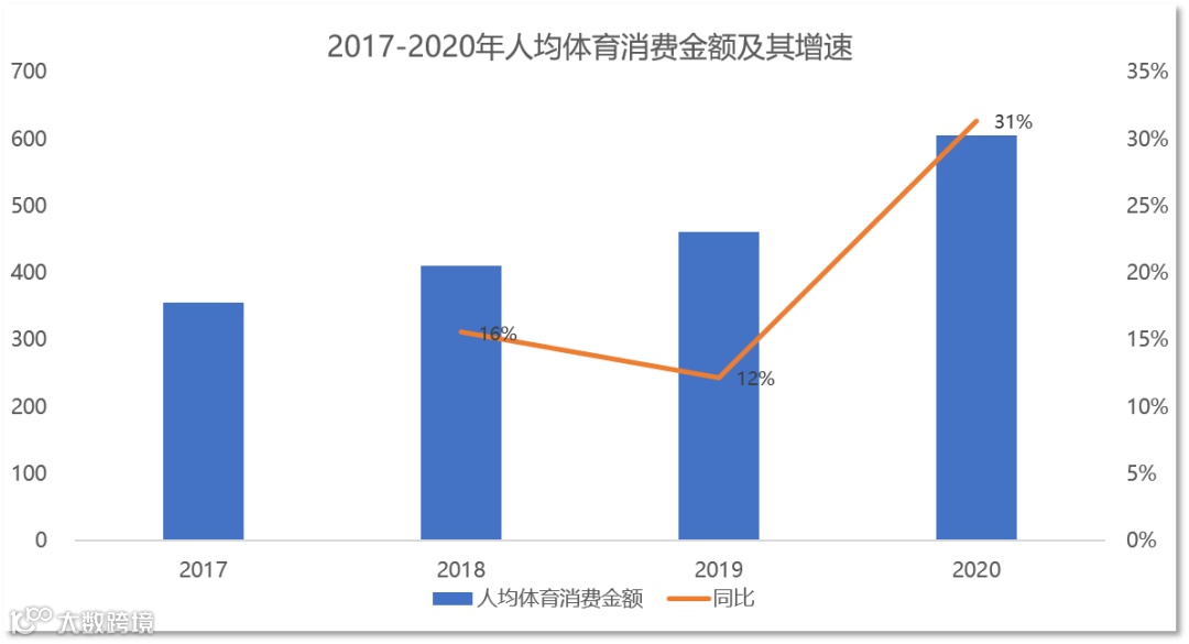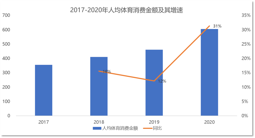 随着国民经济和居民收入的不断增长,近几年,体育消费市场持续扩容。近期世界级运动盛会的举行也推高了体育消费市场的热度。京东大数据显示,2017年-2020年人均体育消费金额持续提升,2020年同比增长超3成。