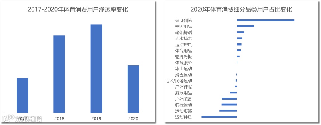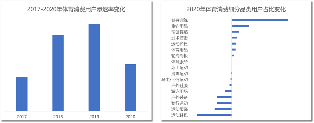 在国家促进全民健身和体育消费的政策推动下,体育市场的活力和体育消费的热情不断被激发,经常参加体育锻炼成为很多人的一种生活方式。2017-2019年,线上体育消费的用户渗透率持续提升,2020年受到新冠疫情的影响,一些群体项目难以展开,渗透率有所下滑。