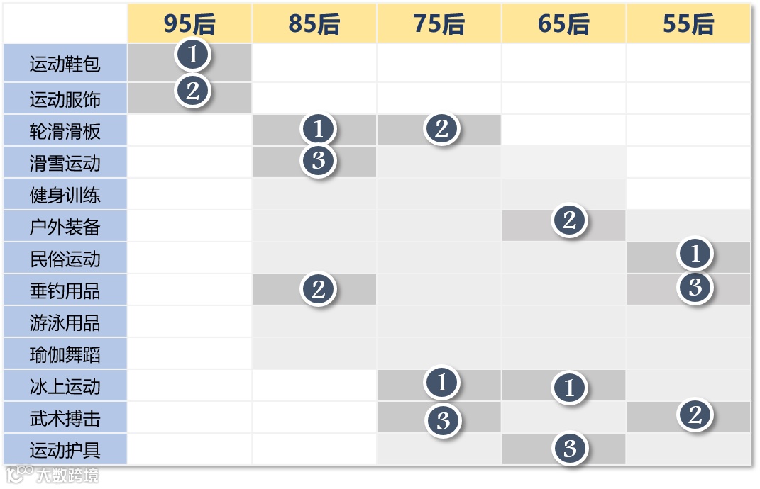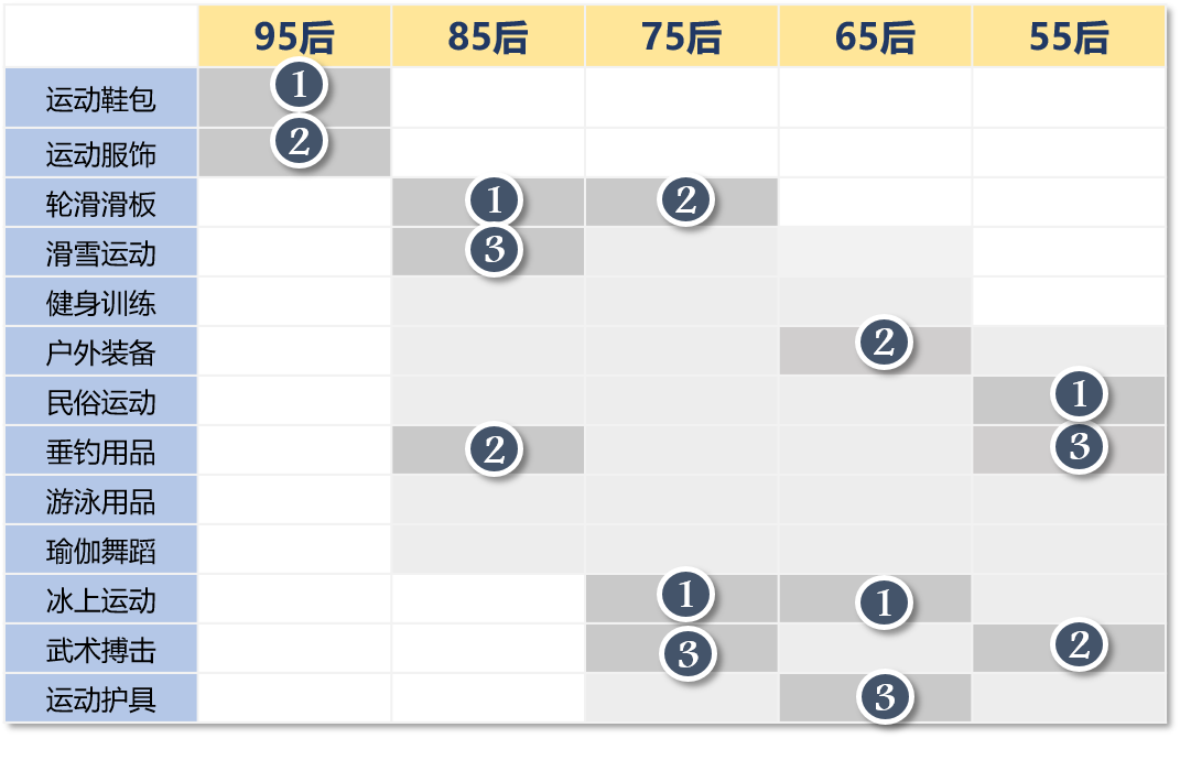 从不同年龄用户的消费偏好来看,95后(16-25岁)最偏好购买“外在”的运动鞋包和服饰,而随着年龄的增长,逐渐确定了偏爱的运动项目,开始专注购买某项体育用品,提升该项运动的专业“内核”。其中,85后(26-35岁)最偏爱:轮滑、垂钓和滑雪;75后(36-45岁)最偏爱:冰上、轮滑和武术搏击;65后(46-55岁)最偏爱:冰上、户外和运动护具;55后(56以上岁)最偏爱:民俗运动(毽子、响鞭、拔河、空竹等)、武术搏击和垂钓等相关用品。