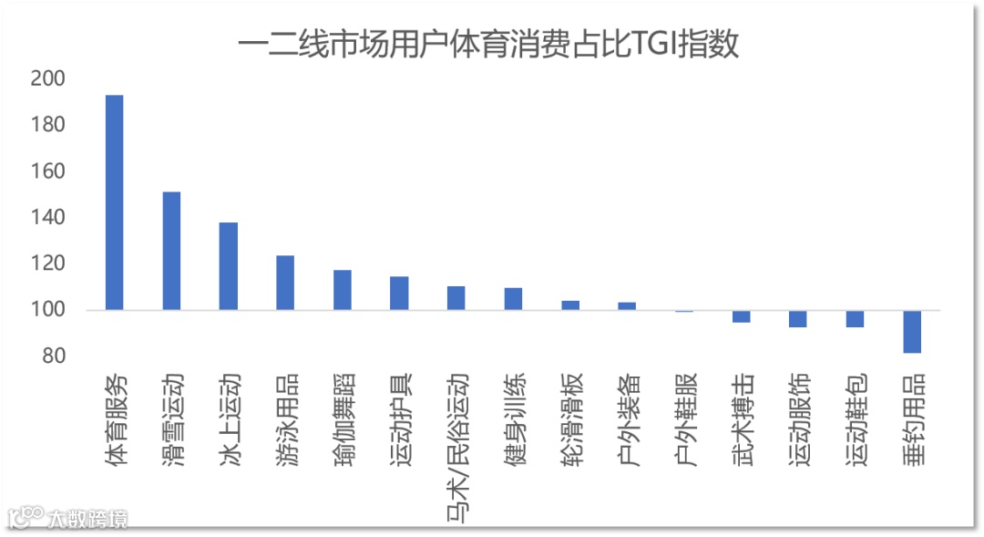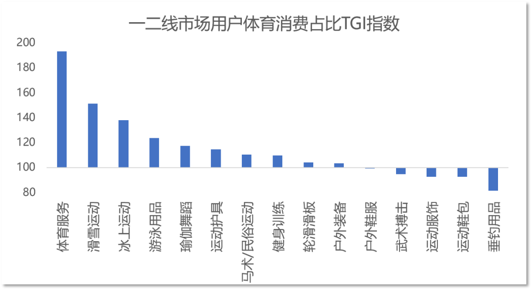 从不同线级城市的消费结构来看,一二线市场的用户更偏好体育服务、冰雪、游泳和瑜伽,而下沉市场的用户更喜欢购买垂钓、体育鞋服和武术搏击类的体育用品。