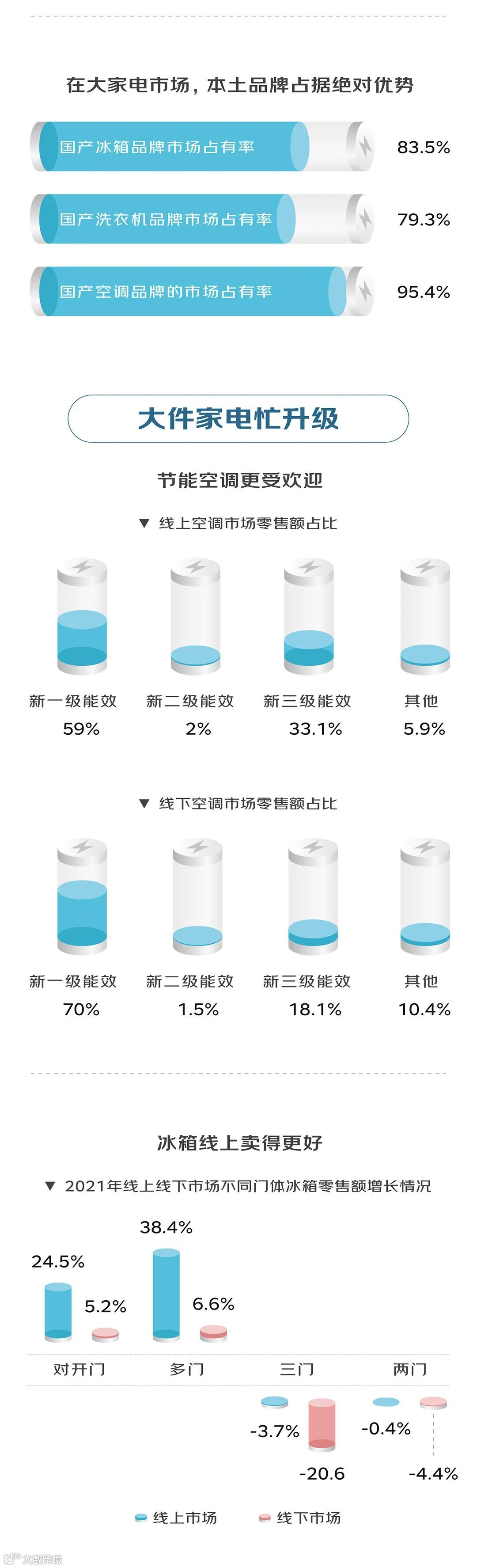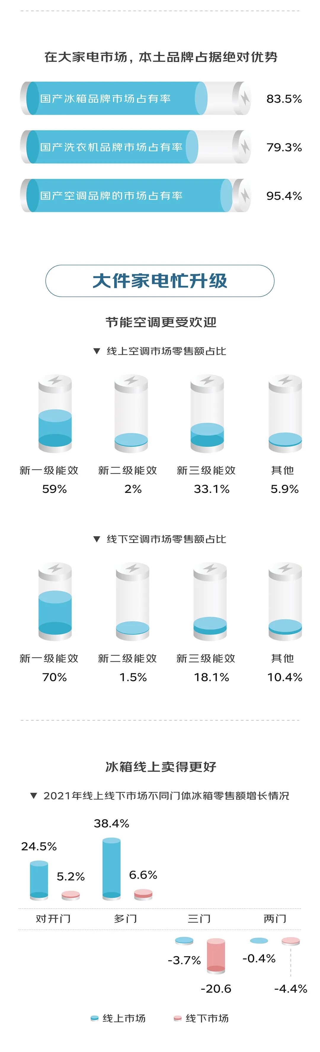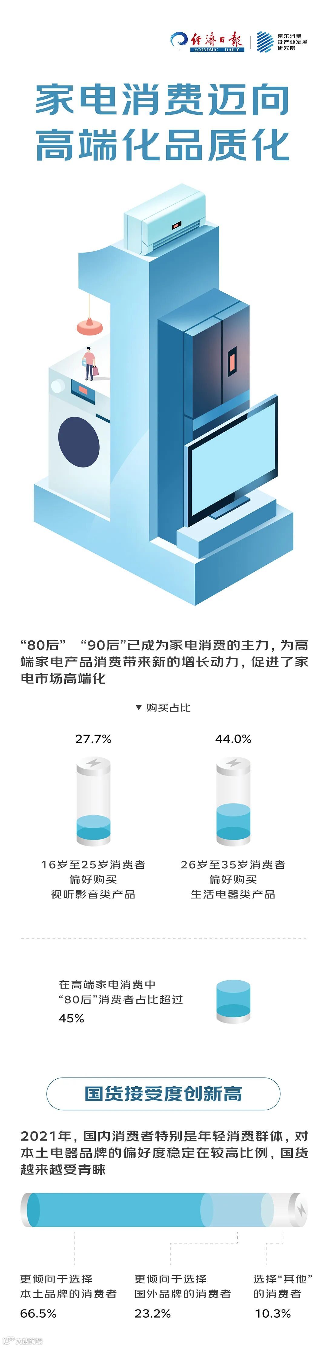 2021年,“升级”成为家电消费的关键词。特别是消费者不断求新、求好的消费需求,对家电市场发展起到了强劲的拉动作用。从中长期发展趋势看,随着消费理念持续升级及消费人群快速拓展,家电产品升级换代步伐将进一步加快,家电市场有望实现更高质量的发展。