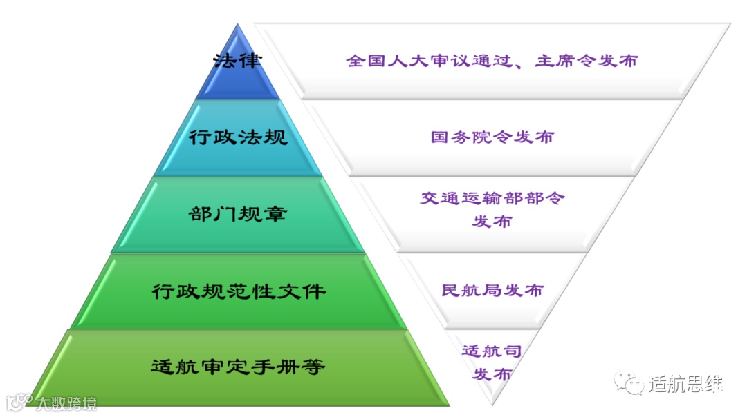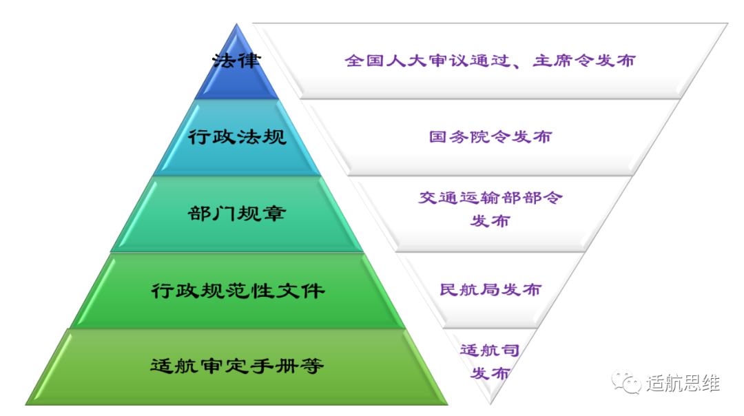 法律:由全国人大或全国人大常委会制定。涉及适航审定工作的法律主要为《中华人民共和国民用航空法》,其它相关法律包括《中华人民共和国行政许可法》、《中华人民共和国行政处罚法》、《中华人民共和国安全生产法》等。