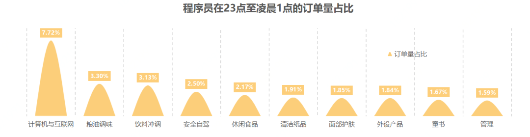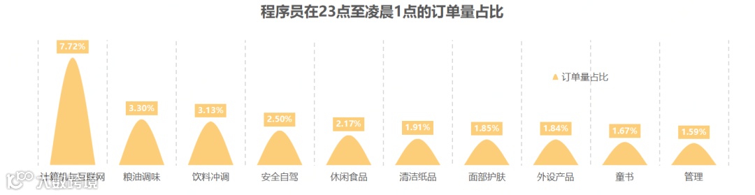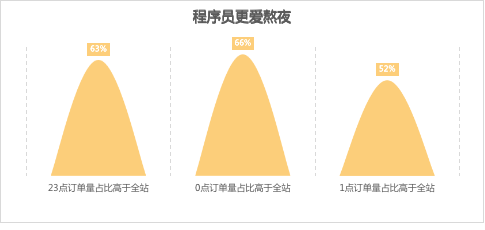 对比其他职业,程序员们更喜欢晚上下单,25%的订单在夜晚11点至凌晨1点之间产生,23点、0点的订单量占比高于全站60%,凌晨1点订单量占比高于全站50%。