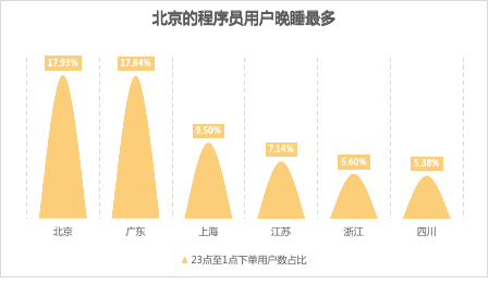 从消费活跃度来看,夜间下单的程序员用户占比最多的地区是北京,其次是广东、上海、江苏、浙江和四川。