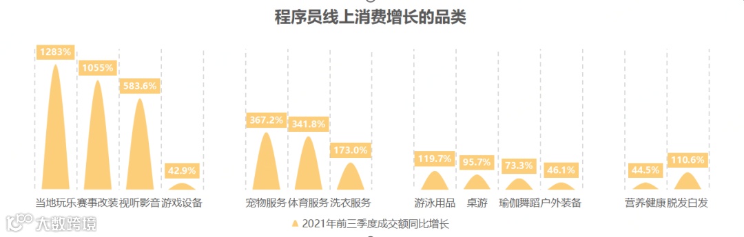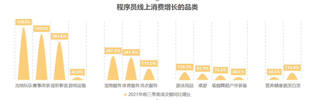 程序员往往要应对很多突发的任务,各种线上服务的消费增长也很高。宠物服务、体育服务成交额同比增长超过3倍,洗衣服务成交额同比增长超过1.5倍。