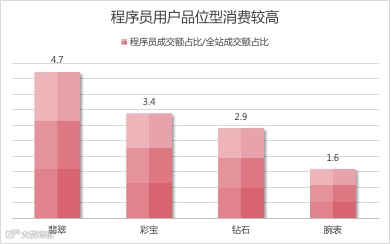 此外,程序员的品位型消费较高,翡翠、彩宝的成交额占比超过全站的3倍,钻石、腕表的成交额占比超过全站的3倍、1.6倍。