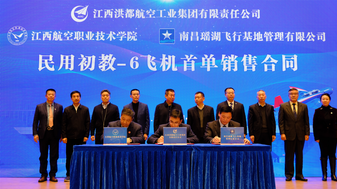 12月12日,民用初教6飞机首单签约活动在南昌举行。航空工业洪都、江西航空职业技术学院、南昌瑶湖飞行基地管理有限公司、中国农业银行江西分行分别签署了首单用户销售合同、校企合作及航空器租赁协议、银校战略合作协议、银企合作协议。