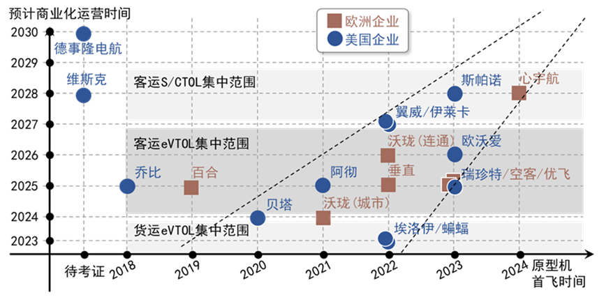 美国企业维斯克的G6、阿彻(Archer)的Midnight以及英国企业垂直(Vertical Aerospace)的VX4同属于混合构型客运eVTOL飞机;美国企业贝塔(Beta Tech.)的Alia(客运型),德国企业沃珑的VoloRegion以及法国企业优飞(Ascendance Flight Tech.)的F-ATEA同属于复合构型客运eVTOL飞机,这些企业正瞄准2025-2027年间商业化运行目标开展激烈的竞赛。