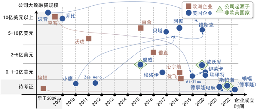 (美、欧主要AAM飞机研制企业的成立和并购重组时间,以及融资大致规模)