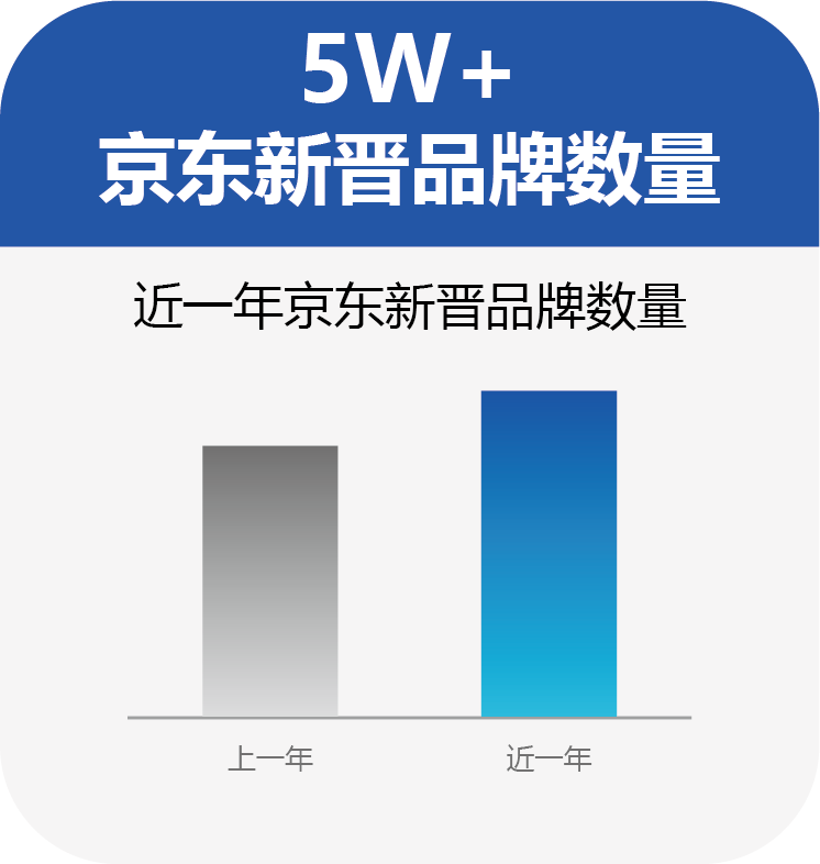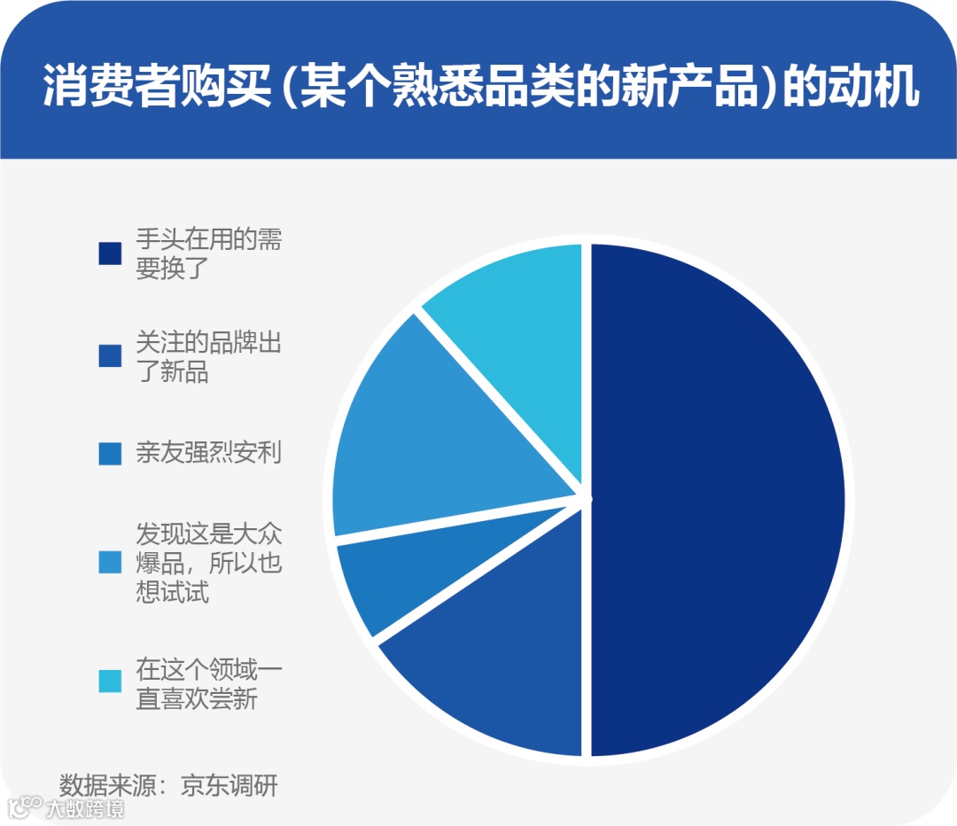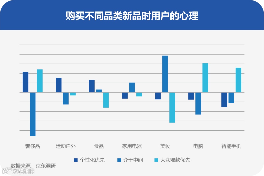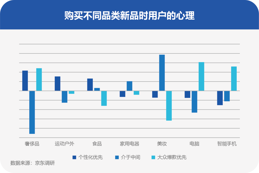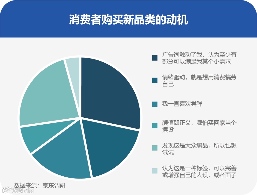 在上升且多元的市场中,消费者对新产品响应活跃,试错空间增⼤,品牌创新⼒得到空前的激活:近⼀年来京东新品销售额占⽐达62%*;另有调研显⽰:愿意马上尝试“不熟悉的新品类”商品的消费者达25%;