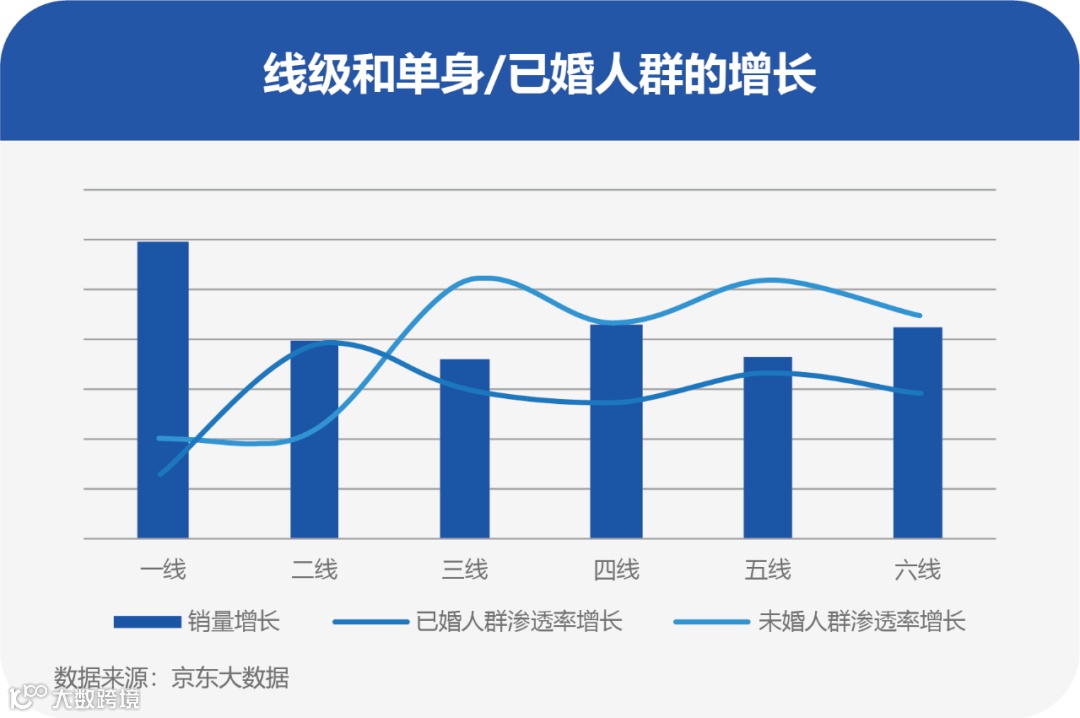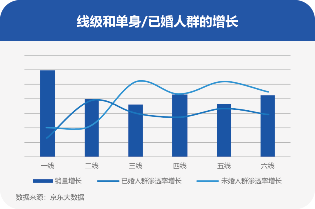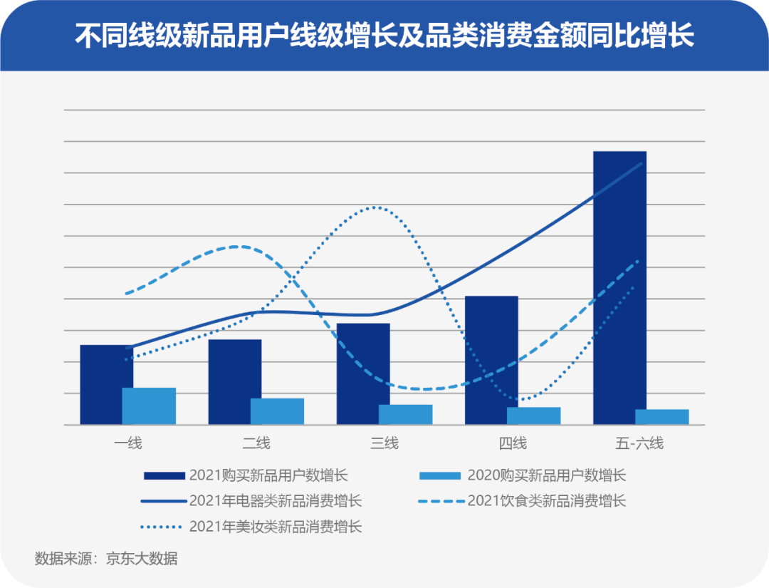 同时根据京东⼤数据发现,从购买新品的⽤户数量增⻓来看,2020年时不同线级城市新品消费者的增速实际上呈由低(线)到⾼的递增态势;⽽到2021年,这⼀趋势发⽣了反转,中低线城市新品消费者的增速⼤幅提升,总体增速从⾼线到低递增。