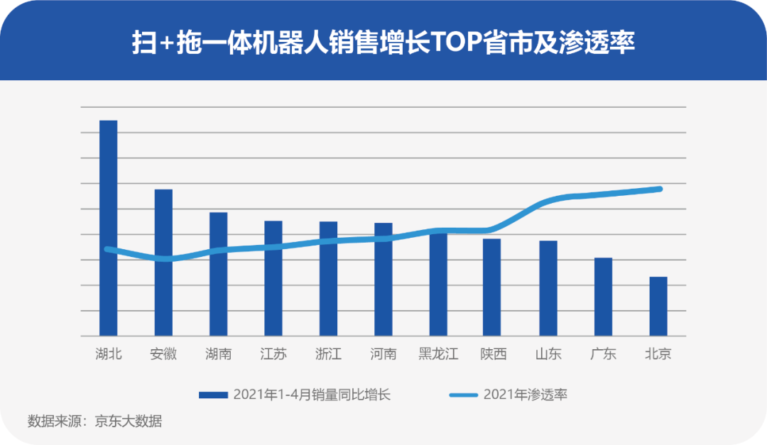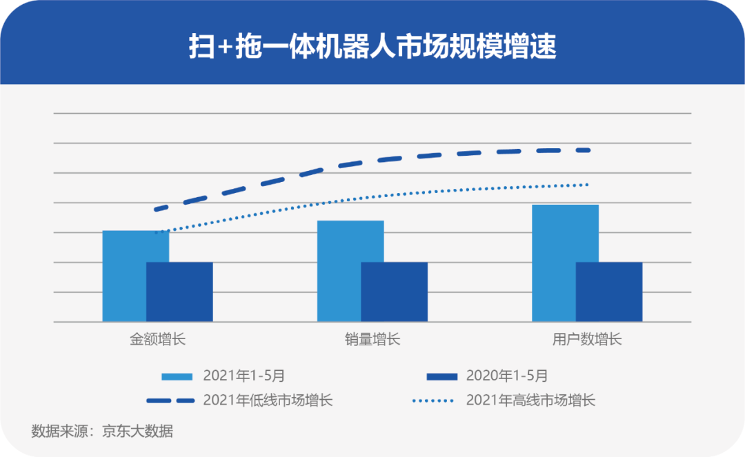 京东针对2020年以来的消费趋势,发现除了吸⼒提升、智能避障、路径规划等常规提升外,⾃动集尘和扫拖⼀体机⾃动清洗也是热⻔⽅向。2021年1-5⽉,“扫+拖一体机器⼈”的销量同⽐增⻓70%以上,远超扫地机器⼈增⻓,成为该细分品类中消费者需求迫切、各⼚商发⼒⻆逐的崭新赛道。