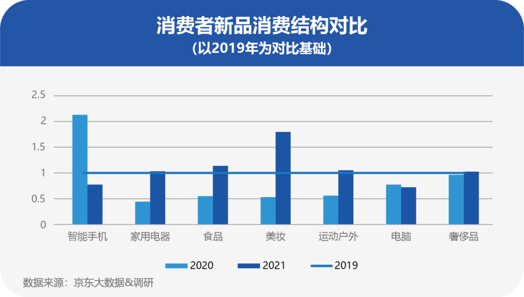 2019-2021三年中,只有奢侈品新品的消费结构基本⼀致,说明这部分新品消费需求基本不受疫情及居家的影响。