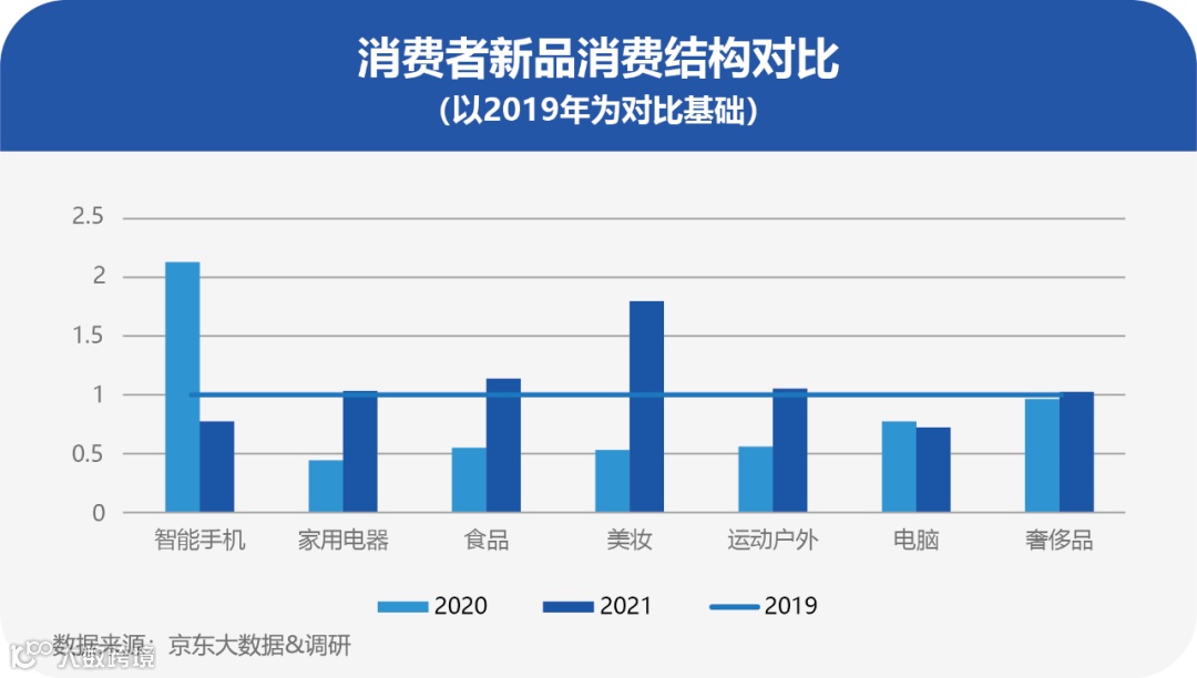 如果参照2019年全年新品消费⼤数据(⼈次,近似去重)可以发现,事实上2020年上半年新品消费结构⽐2019年有着较⼤偏差;⽽2021年事实上回归、趋近到2019年的结构占⽐,其中⼿机、电脑等相对满⾜个人需求的新品消费占⽐下降,但美妆占⽐⼤幅增⻓,此外⻝品、家电、运动等占⽐在2021年略⾼于2019年。