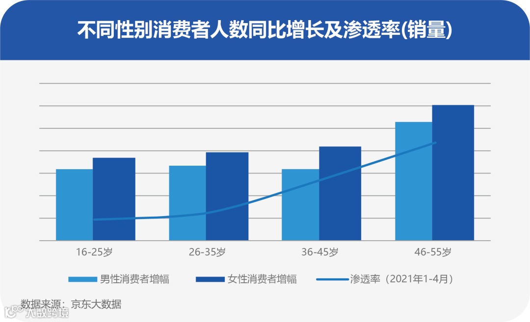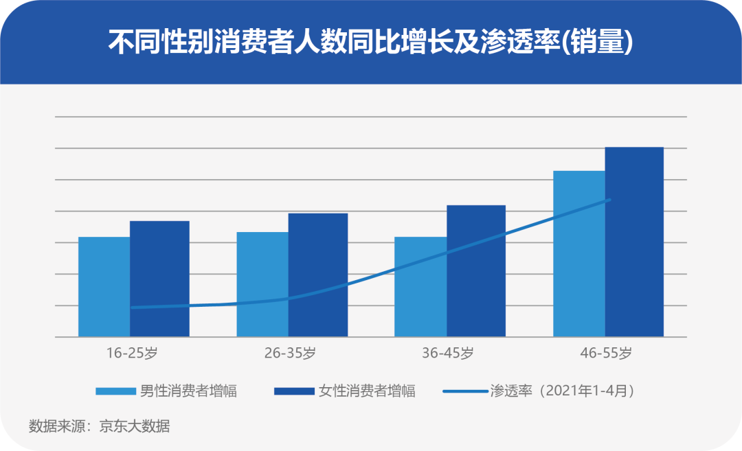 在京东平台上“低糖电饭煲”的销量在2021年1-4月同比去年增 160%左右,其中年龄越大的人群需求越大,其中46-55岁人群销量同比增 3.3倍,增幅接近25岁以下人群的4倍,而且渗透率也是随着年龄增 而递增。从性别来看,女性消费者约为男性的1.2倍,而且在36岁往上的年龄段,女性消费者人数相比男性增幅更大。