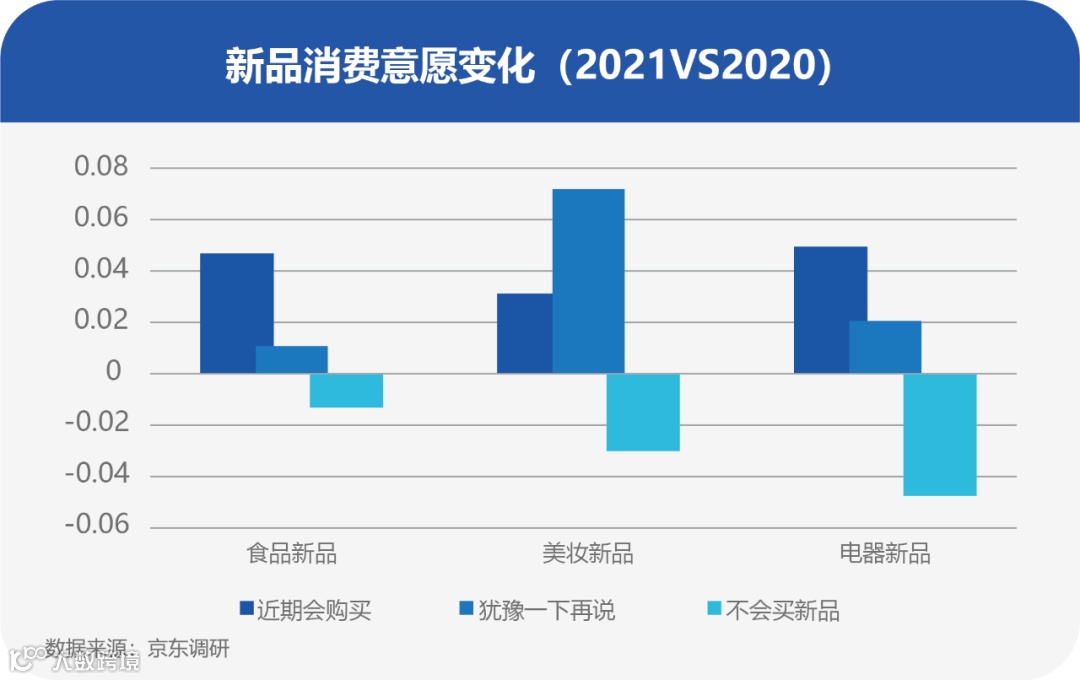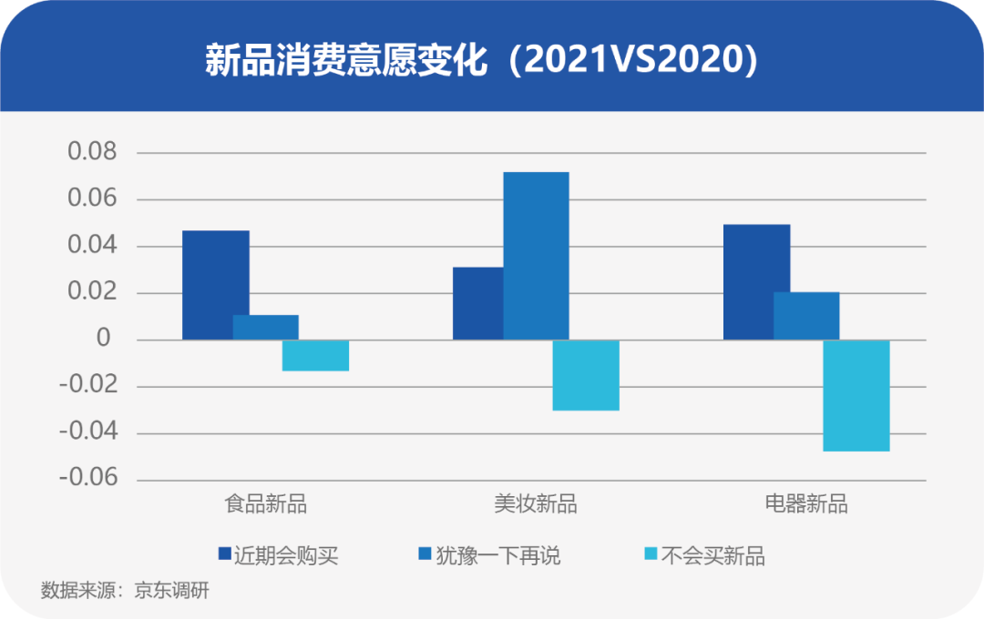 而在2021年,消费者的心态已有了非常积极的转变。从京东大数据研究院与“京洞察”在连续两年(2020年5月、2021年5月)对当时“近期有过新品购买行为的用户”的调研中发现,相比去年,对电器(包括手机、电脑、家电)、美妆和 品类新品愿意“ 上就买”的比例都有所上升,“不会考虑买”的比例无一不出现了下降(下图)。