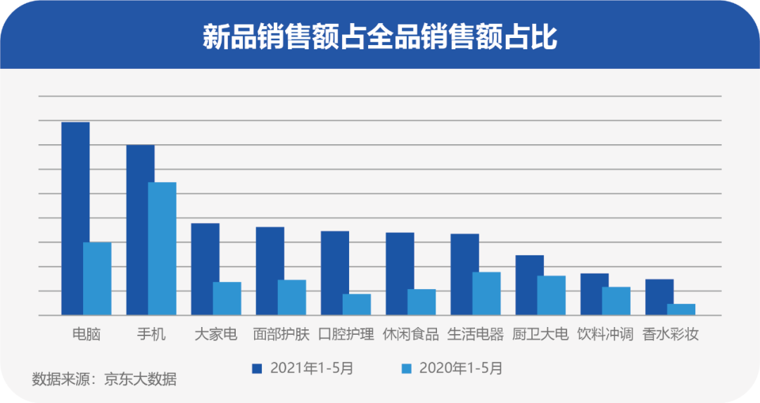 (上组图数据来源:京东小魔方、京东JC2M智能制造平台、益普索中国联合撰写发布《2021京东小魔方年中新品消费趋势报告》;上一年指2019年4月-2020年3月;近一年指2020年4月-2021年3月。备注:京东新品销售额占比指京东新品年度销售额/占整体销售额的比例)