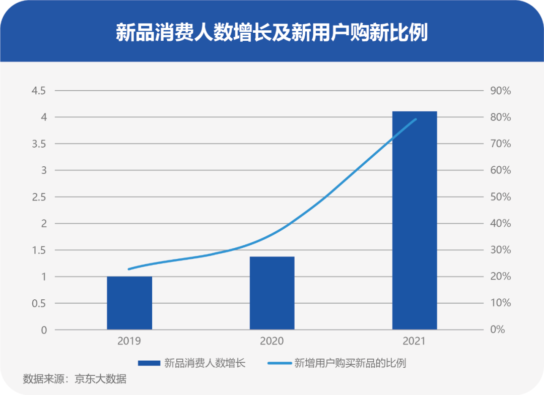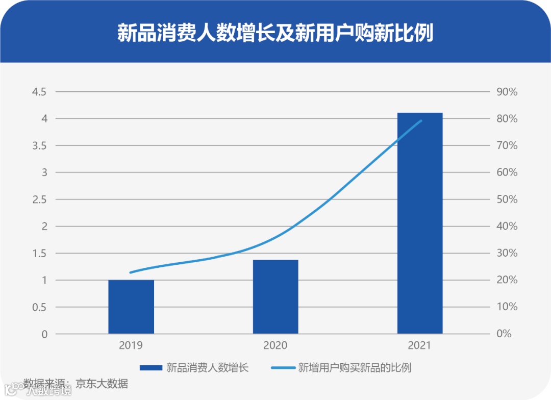 数据显示,2021年1-4⽉京东新品购买⼈次(近似去重)同⽐去年增⻓近200%,这其中,新⽤户购买新品的⽐例也在2021年有了⼤幅上升。