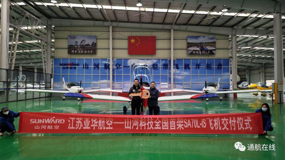2022年12月29日,在湖南山河科技股份有限公司厂房内,山河科技总经理邓宇亲手将钥匙交到江苏亚华航空有限公司董事长沈刚手中,全国首架AURORA SA70L-iS轻型运动飞机顺利交付。