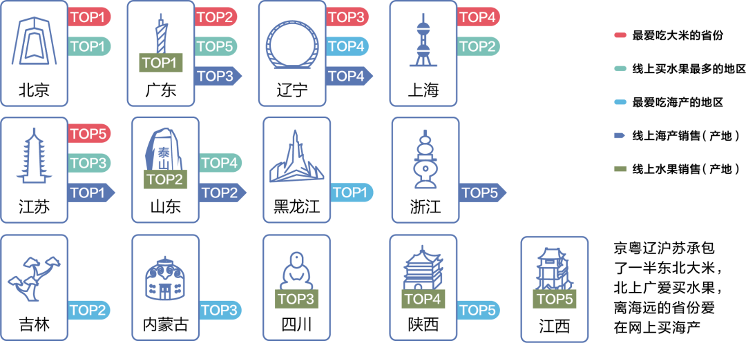京粤辽沪苏承包了一半东北大米,北上广爱买水果,离海远的省份爱在网上买海产。