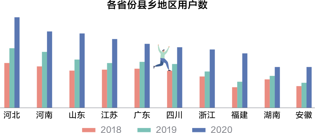 从近3年的发展来看,多数省份县乡地区的京东用户数都出现了高于50%的明显增长。
