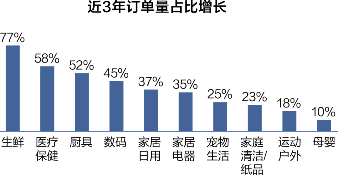 从近3年消费结构的变化来看,生鲜、医疗保健的占比增长最高。