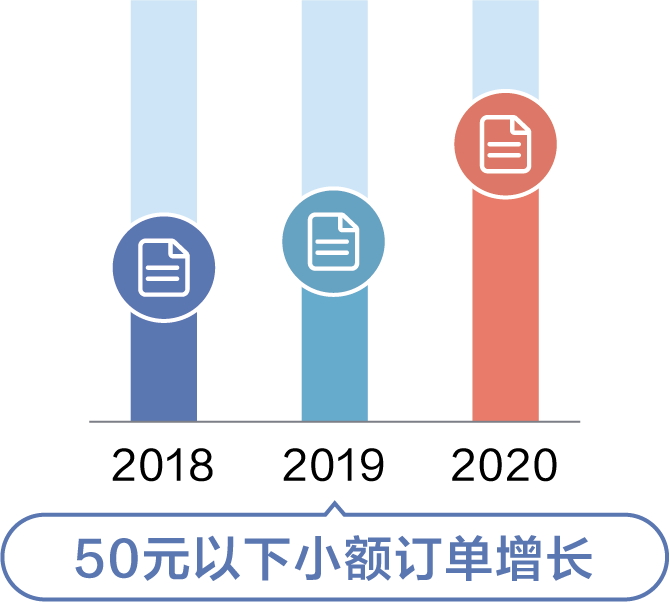2020年,直播电商、社交裂变等消费方式红火,带动了生鲜、日用品等家庭常用的小额订单量增速超过整体的2倍。