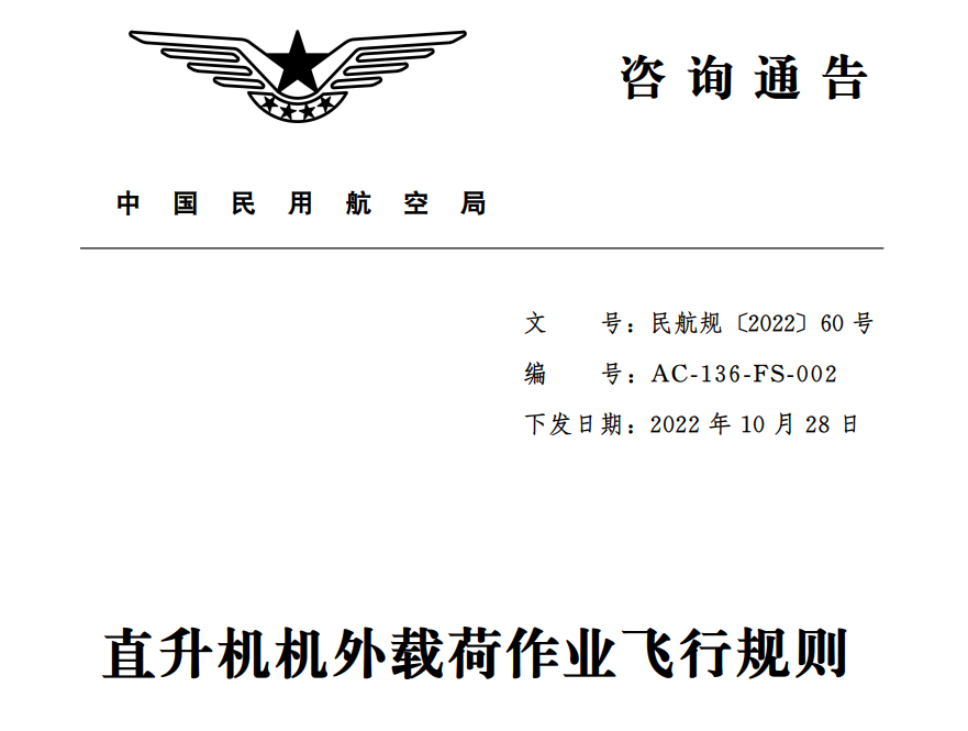 10月31日,民航局综合司印发《直升机机外载荷作业飞行规则》(民航规〔2022〕60号),旨在规范运营人直升机机外载荷作业飞行,降低外载荷作业安全风险。文件内容包括适航性要求、作业规则和要求、合格审定文件要求、合格审定演示验证要求等,明确外载荷作业运行要求,细化外载荷作业资质审定标准,为实施外载荷作业的运营人和局方监察员开展合格审定工作提供规范和指导,适用于按照CCAR-136部实施外载荷作业运行的运营人。该咨询通告自下发之日起30日后生效。部分内容摘录如下。
