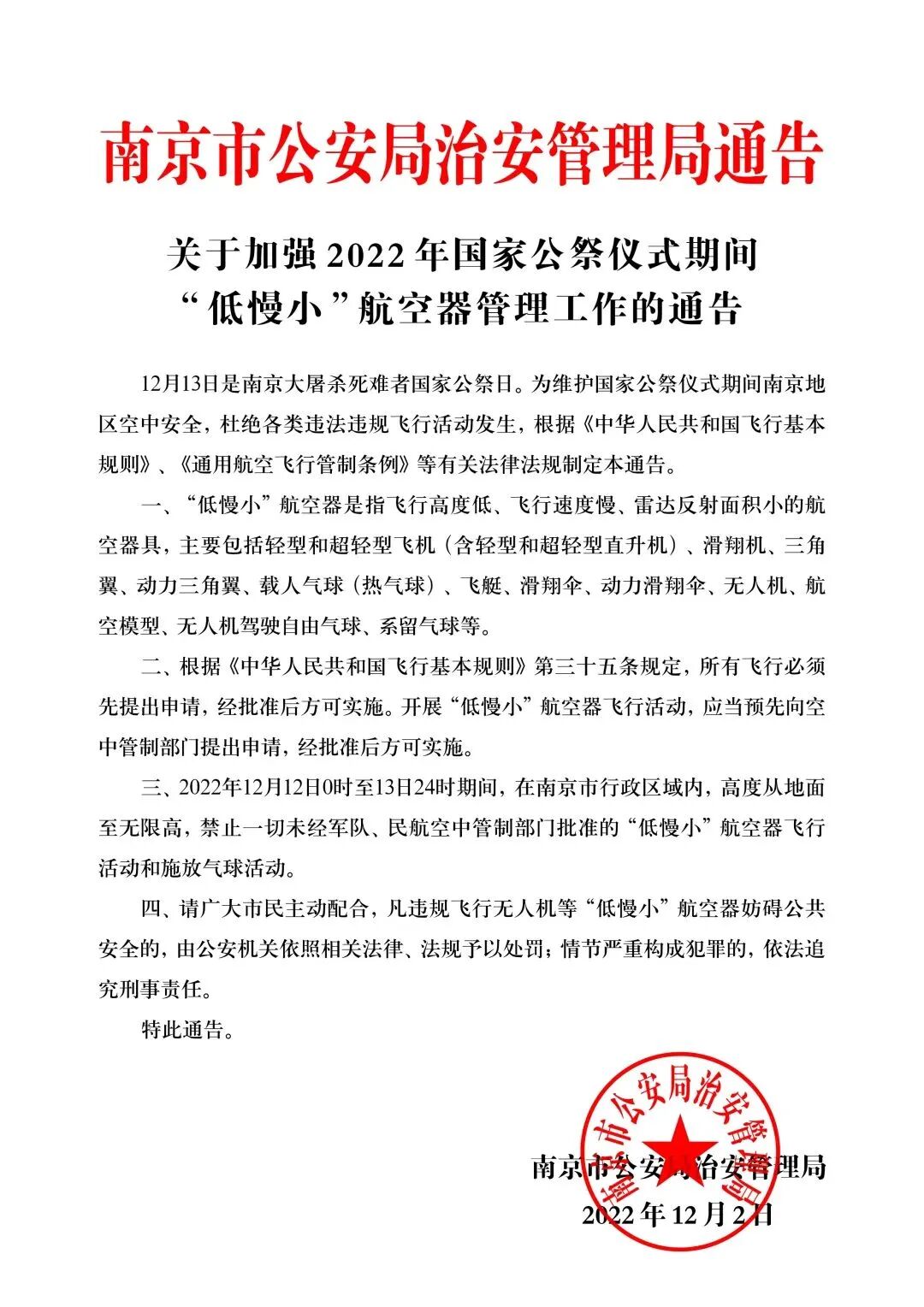 12月13日是南京大屠杀死难者国家公祭日。据南方警方最新消息, 2022年12月12日0时至13日24时期间 ,在南京市行政区域内,高度从地面到无限高,禁止一切未经批准的“低慢小”航空器飞行活动和施放气球活动。