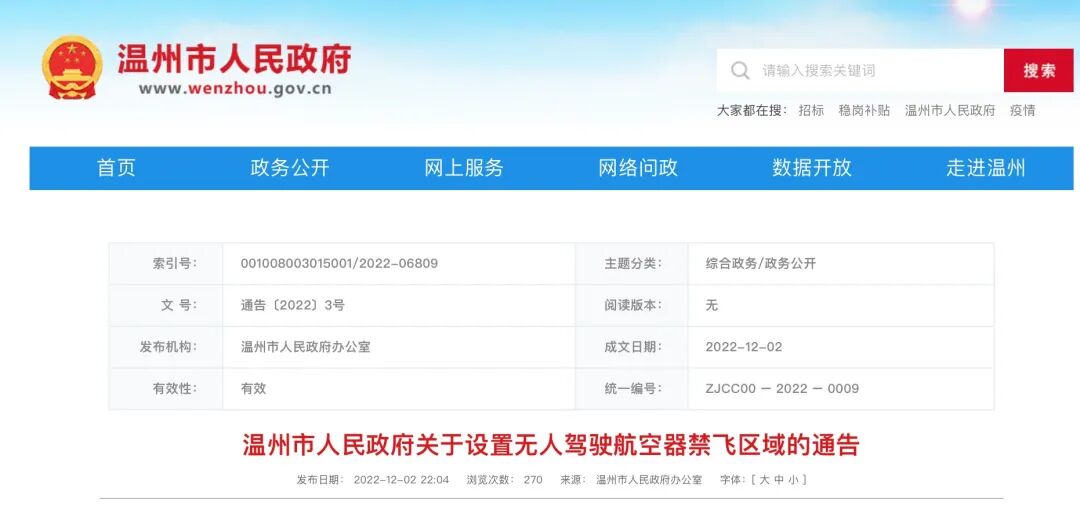 浙江温州:关于设置无人驾驶航空器禁飞区域的通告