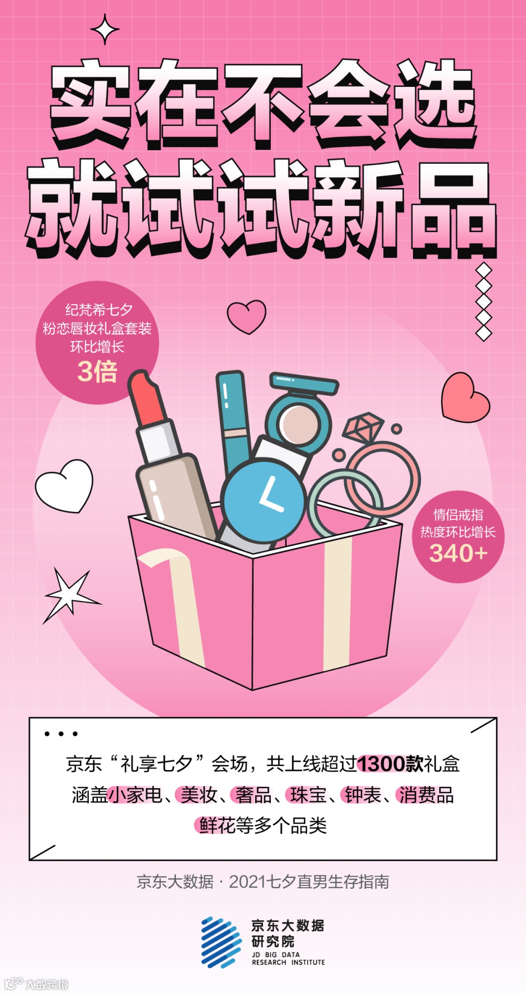 在京东新品消费阵地京东小魔方,已上线超百款时尚七夕礼盒。8月12-14日期间,京东七夕节“礼享七夕”专场,共上线超过1300款礼盒,涵盖小家电、美妆、奢品、珠宝、钟表、消费品、鲜花等多个品类,以七夕限定、明星同款、IP联名等形式,表达送礼“新”意。