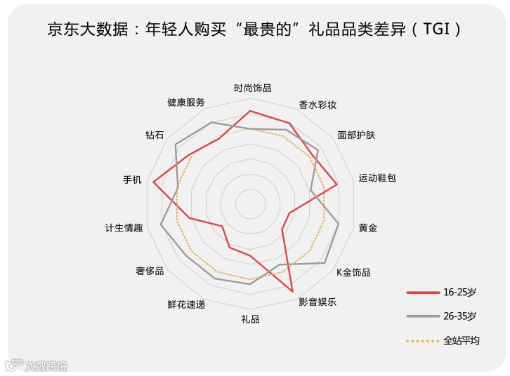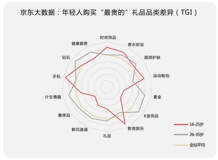 下图可见35岁以下两个年龄段人群的消费数据,25岁以下的Z世代显然更加时尚一些,在时尚饰品、香水彩妆、运动鞋包、影音娱乐和手机等品类上的消费比例更高,而26-35岁人群钱包更有份量,他们更爱买金银珠宝、奢侈品,同时也更注意保养;总体上35岁以下人群的下单金额占到全站的70%,是礼品消费的引领者,他们的偏好代表了这一领域的消费趋势。