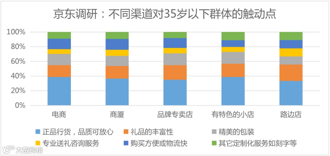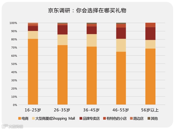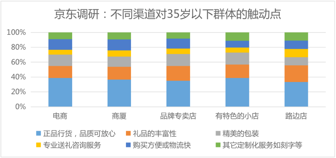 如上图所示,这个群体对电商的认可超过大型商厦及其它渠道,同时电商的物流优势也明显大于其它渠道,不过在礼品的丰富性和个性化需求方面,略低于特色小店等。