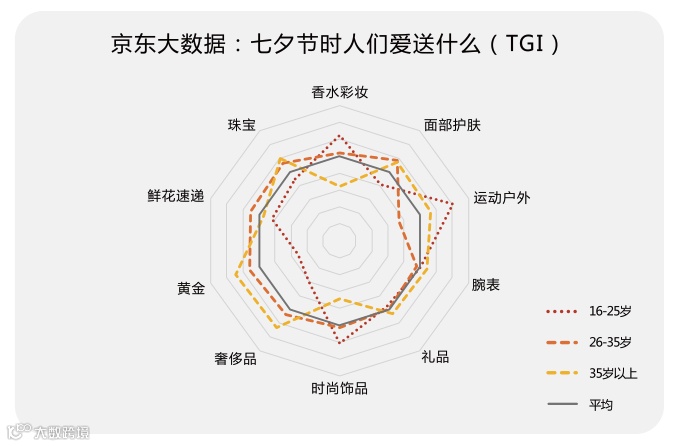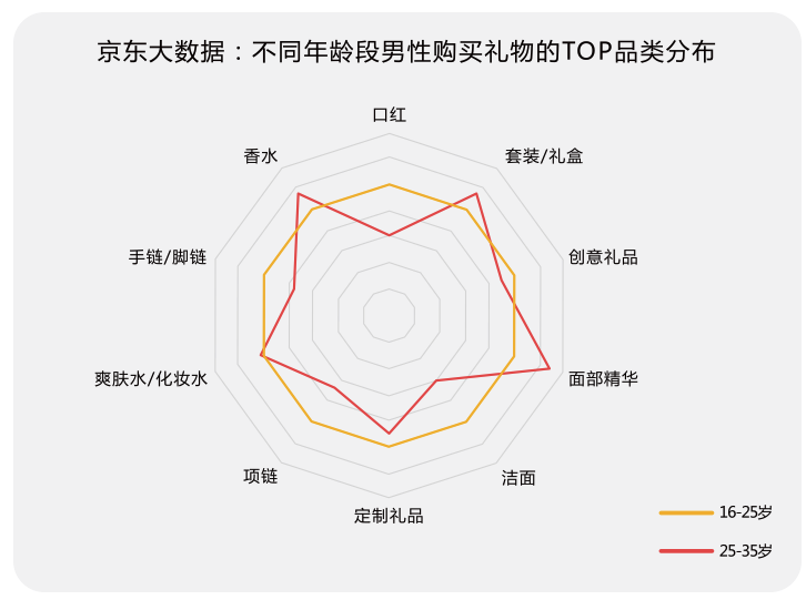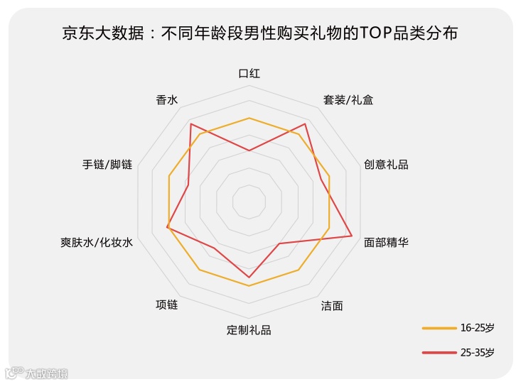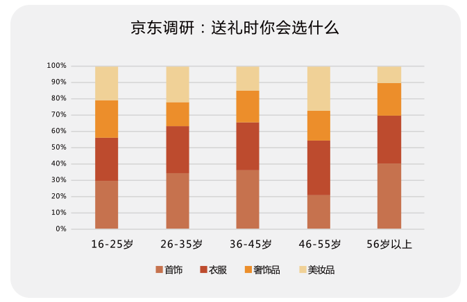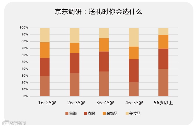 在京东大数据研究院联合京洞察此前的一项调研中发现,选礼物时想送首饰的比例在36-45岁人群中占比最高,而46-55岁的人最想送美妆品,说明这个年纪的人们越来越注重美颜保养。