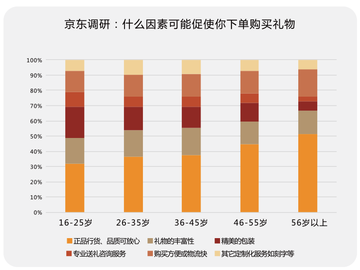 非常有意思的是,调研显示,25岁以下的年轻人(Z世代)似乎更倾向于送奢侈品,而这一比例到了26-35岁就急剧降低。但对比人们在京东的奢侈品类实际消费数据可以发现,25岁以下属于“想送却送不起”,而26-35岁人群“嘴上说不想送却悄咪咪买最多”,不讲武德的那种。