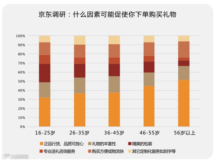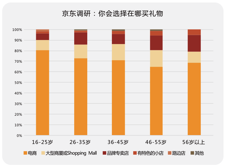 在购买途径的选择方面,年轻人已经习惯了在电商平台购买(80%),这一比例随着年龄增长而略有降低,不过到了56岁以上,出于品牌忠诚度以及京东物流服务的优势,网购的占比再次上升。