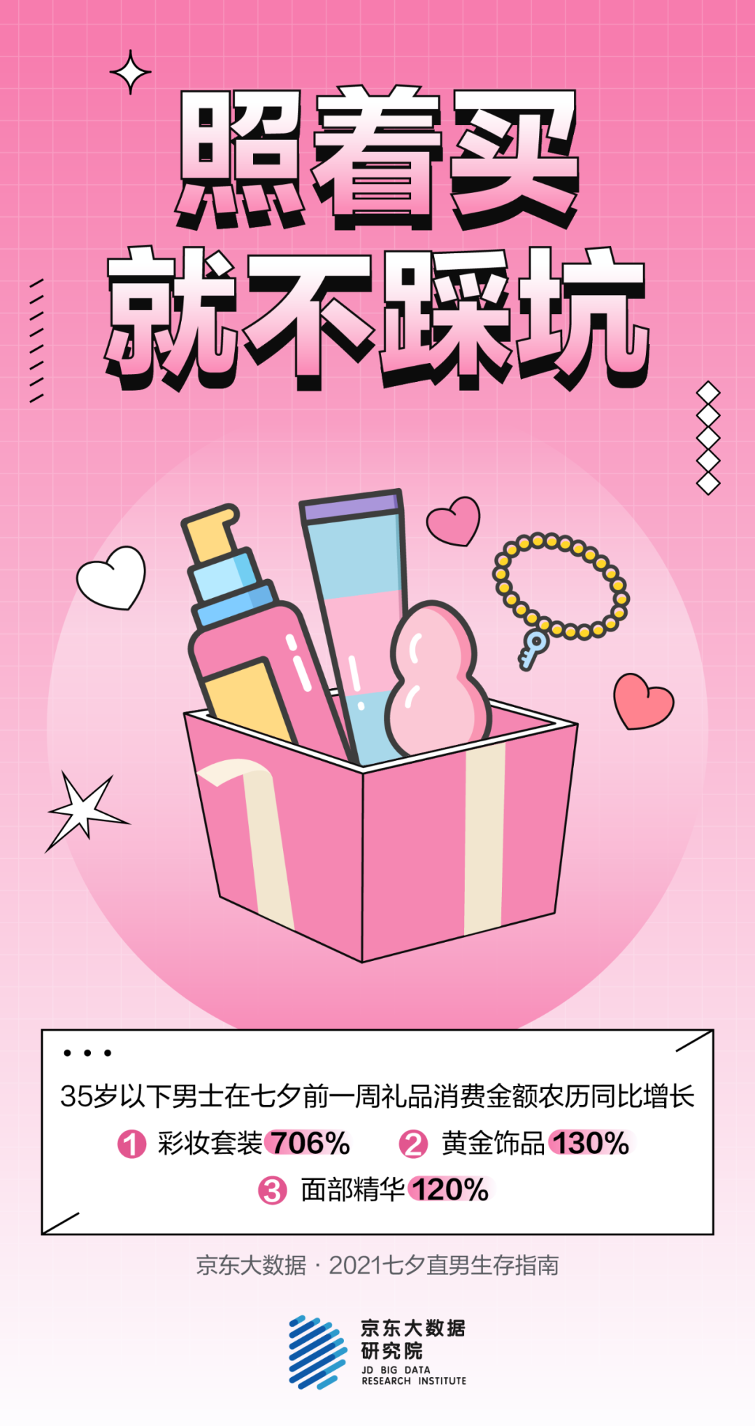 今年七夕前一周,面部精华成交额同比去年七夕同期增长73%,护肤套装礼盒同比增长50%,珠宝中黄金首饰同比增长130%左右。与“送礼物”相关的搜索词热度不断攀升,“情侣戒指”热度环比增长超过420%。