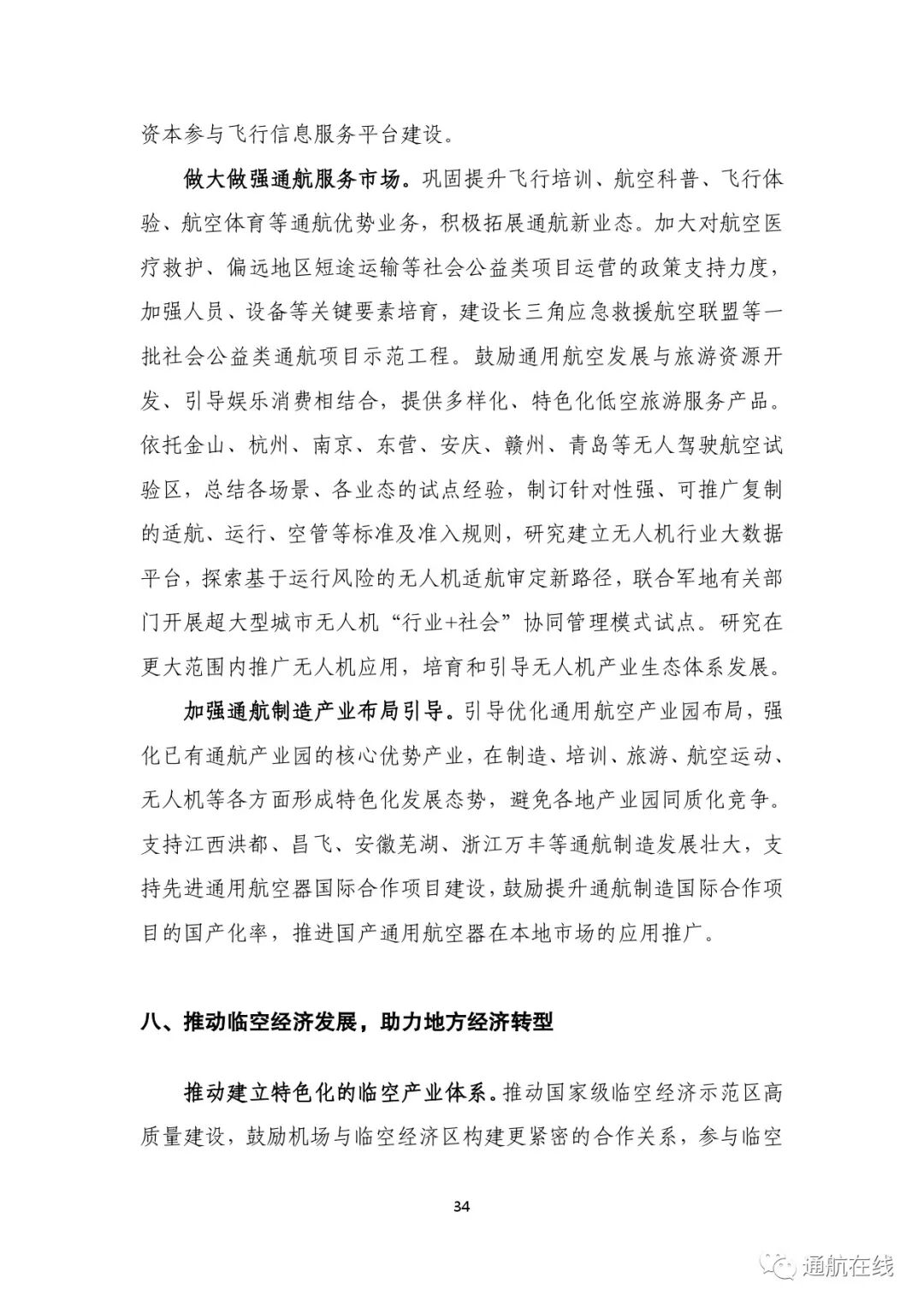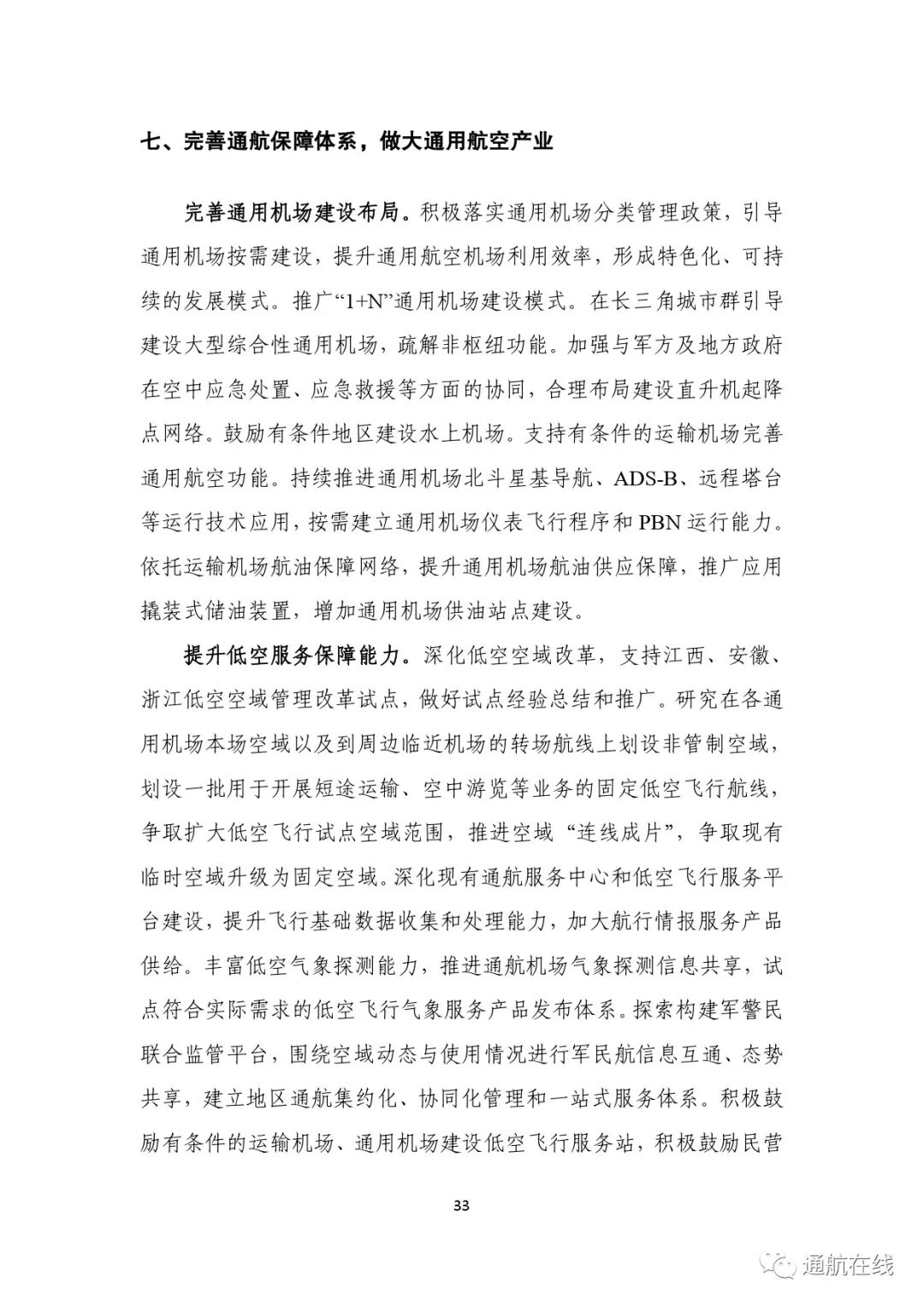 提升低空服务保障能力。 深化低空空域改革,支持江西、安徽、浙江低空空域管理改革试点,做好试点经验总结和推广。 研究在各通用机场本场空域以及到周边临近机场的转场航线上划设非管制空域 , 划设一批用于开展短途运输、空中游览等业务的固定低空飞行航线 , 争取扩大低空飞行试点空域范围,推进空域“连线成片”,争取现有临时空域升级为固定空域。 深化现有通航服务中心和低空飞行服务平台建设,提升飞行基础数据收集和处理能力,加大航行情报服务产品供给。丰富低空气象探测能力,推进通航机场气象探测信息共享, 试点符合实际需求的低空飞行气象服务产品发布体系 。探索构建军警民联合监管平台,围绕空域动态与使用情况进行军民航信息互通、态势共享,建立地区通航集约化、协同化管理和一站式服务体系。积极鼓励有条件的运输机场、通用机场建设低空飞行服务站, 积极鼓励民营资本参与飞行信息服务平台建设。
