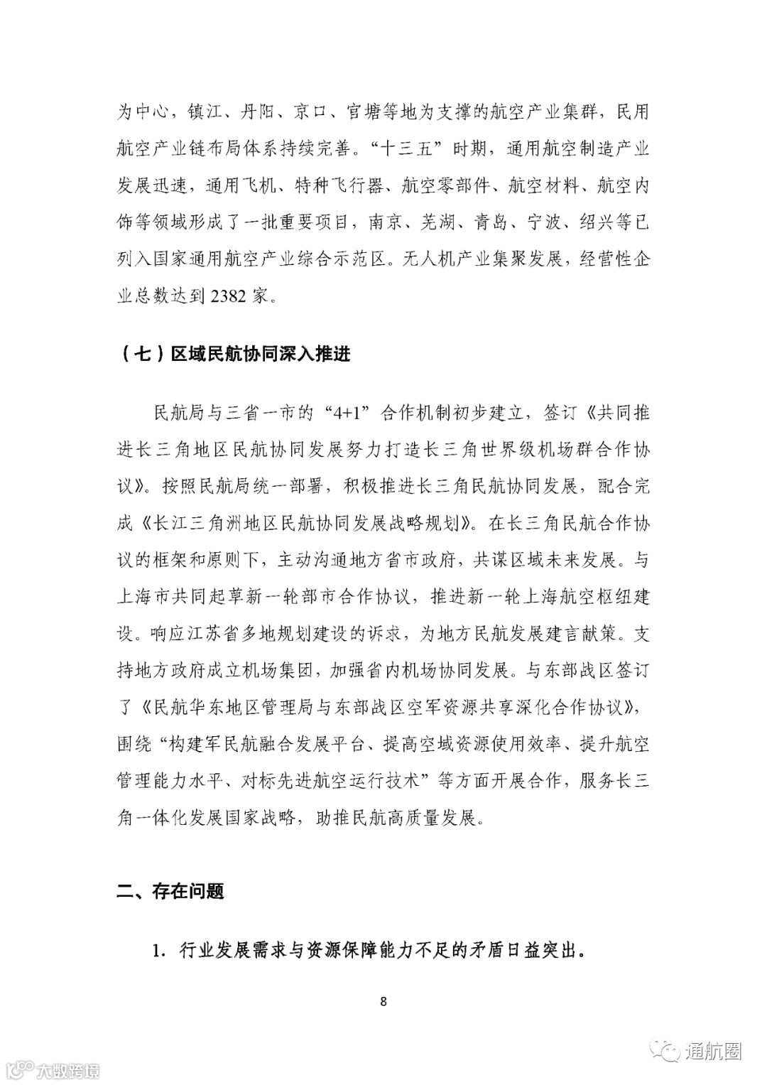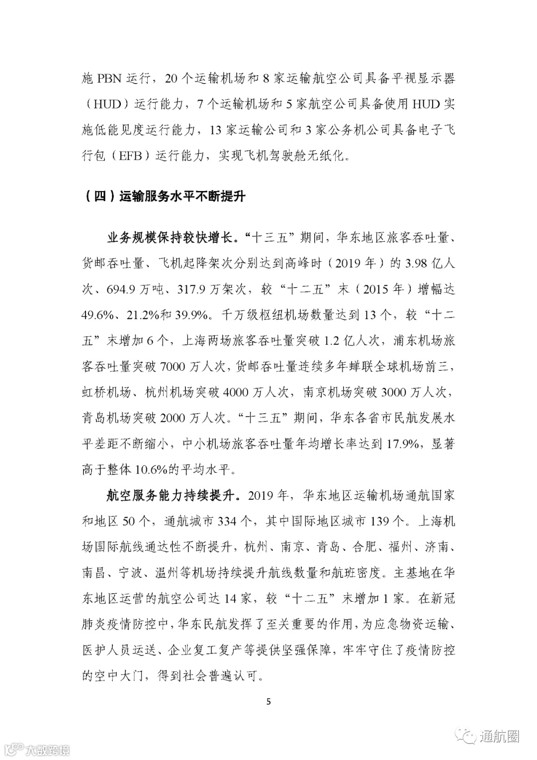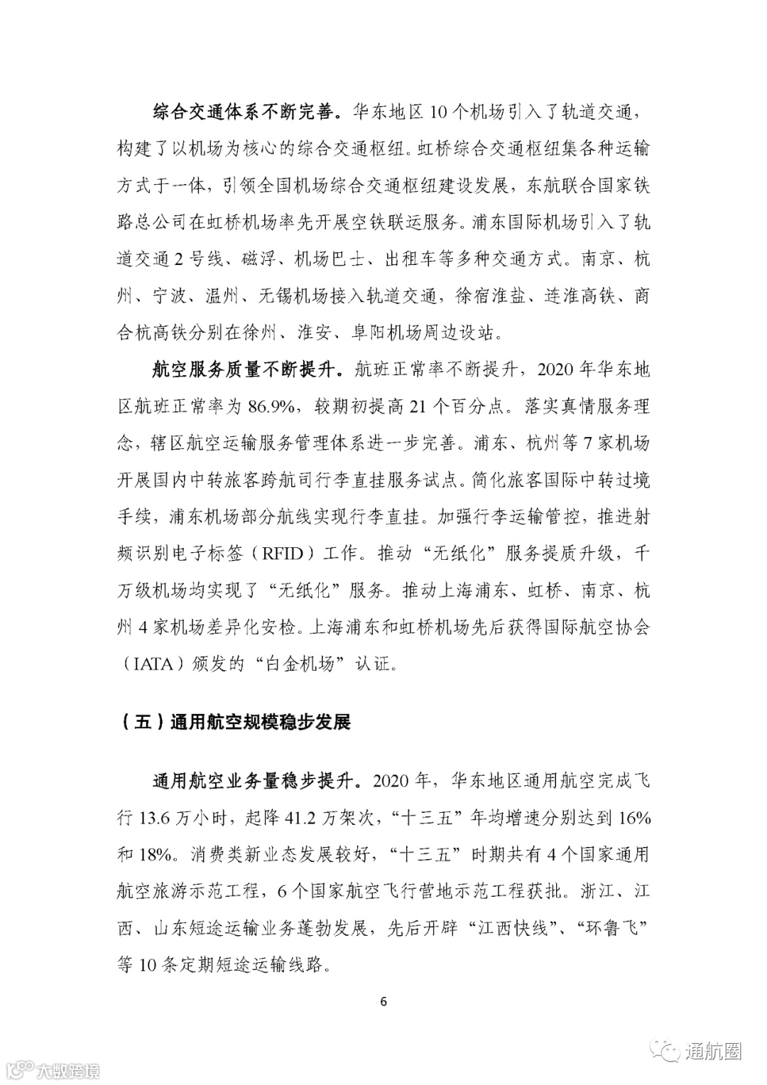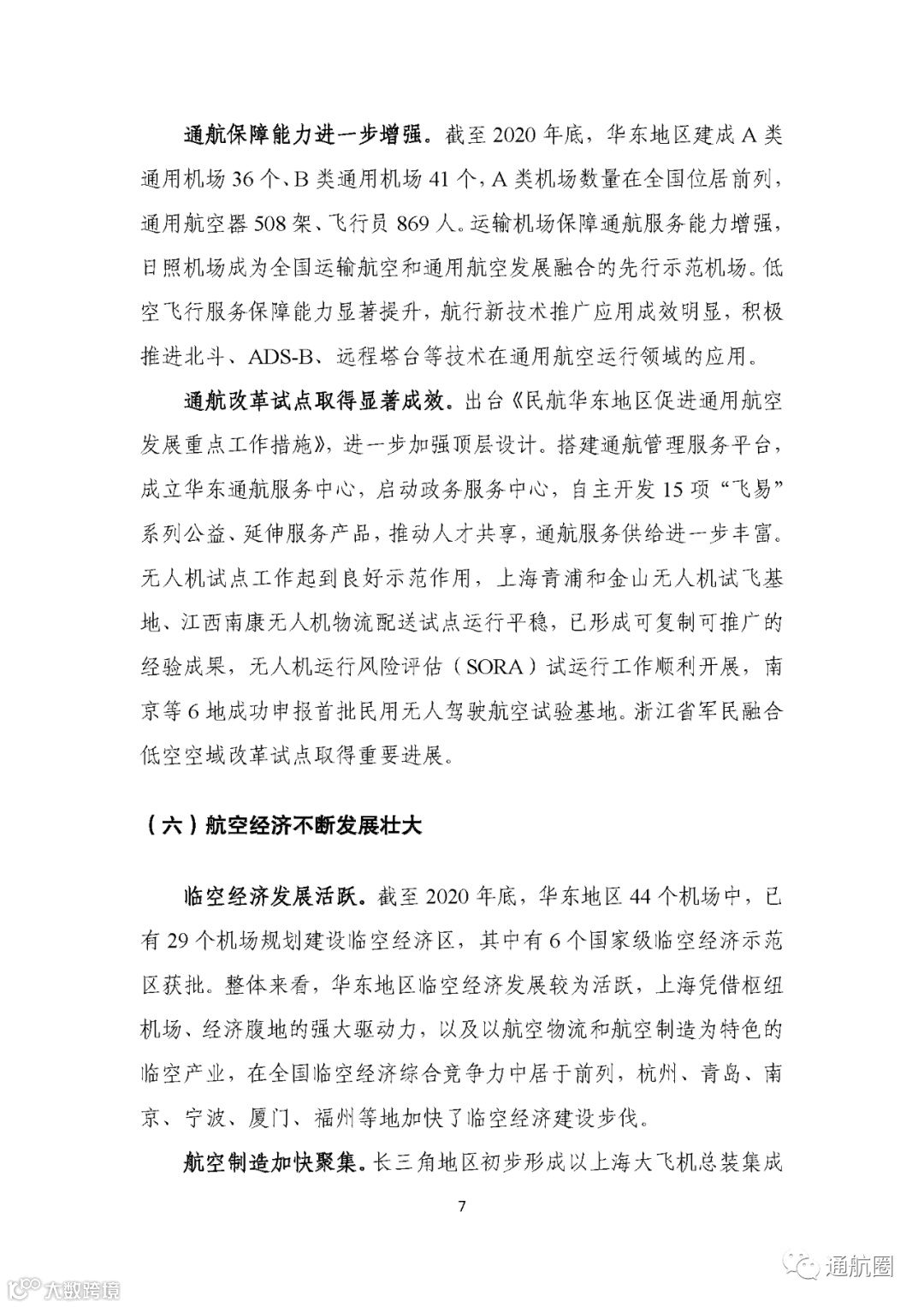 据介绍,十三五时期,华东地区通用航空业务量稳步提升。2020 年,华东地区通用航空完成飞 行13.6 万小时,起降41.2 万架次,“十三五”年均增速分别达到16% 和18%。消费类新业态发展较好,“十三五”时期共有4 个国家通用 航空旅游示范工程,6 个国家航空飞行营地示范工程获批。浙江、江 西、山东短途运输业务蓬勃发展,先后开辟“江西快线”、“环鲁飞” 等10 条定期短途运输线路。通航保障能力进一步增强。截至2020 年底,华东地区建成A 类 通用机场36 个、B 类通用机场41 个,A 类机场数量在全国位居前列, 通用航空器508 架、飞行员869 人。运输机场保障通航服务能力增强, 日照机场成为全国运输航空和通用航空发展融合的先行示范机场。低 空飞行服务保障能力显著提升,航行新技术推广应用成效明显,积极 推进北斗、ADS-B、远程塔台等技术在通用航空运行领域的应用。通航改革试点取得显著成效。出台《民航华东地区促进通用航空发展重点工作措施》,进一步加强顶层设计。搭建通航管理服务平台, 成立华东通航服务中心,启动政务服务中心,自主开发15 项“飞易” 系列公益、延伸服务产品,推动人才共享,通航服务供给进一步丰富。无人机试点工作起到良好示范作用,上海青浦和金山无人机试飞基 地、江西南康无人机物流配送试点运行平稳,已形成可复制可推广的 经验成果,无人机运行风险评估(SORA)试运行工作顺利开展,南 京等6 地成功申报首批民用无人驾驶航空试验基地。浙江省军民融合 低空空域改革试点取得重要进展。