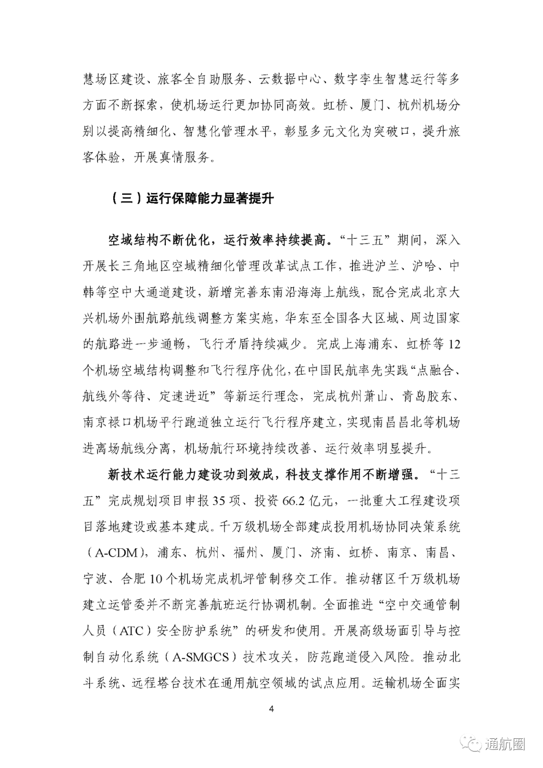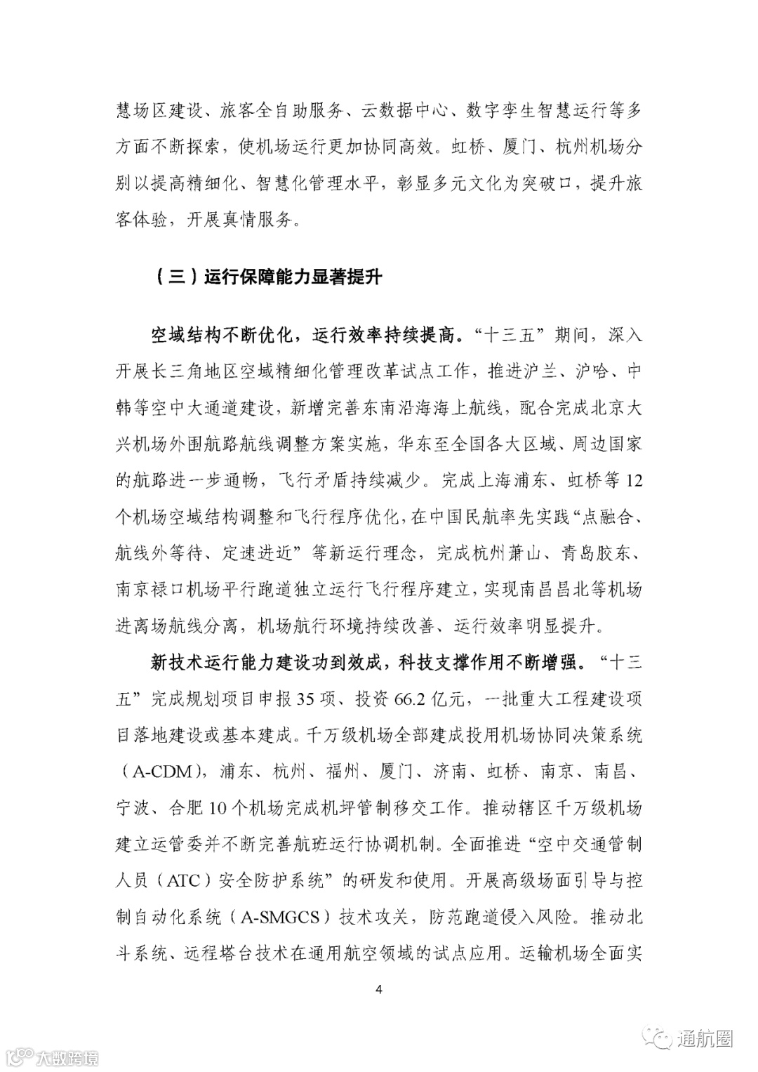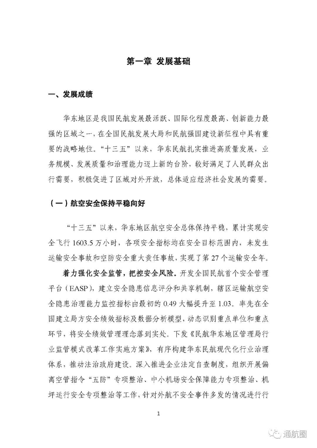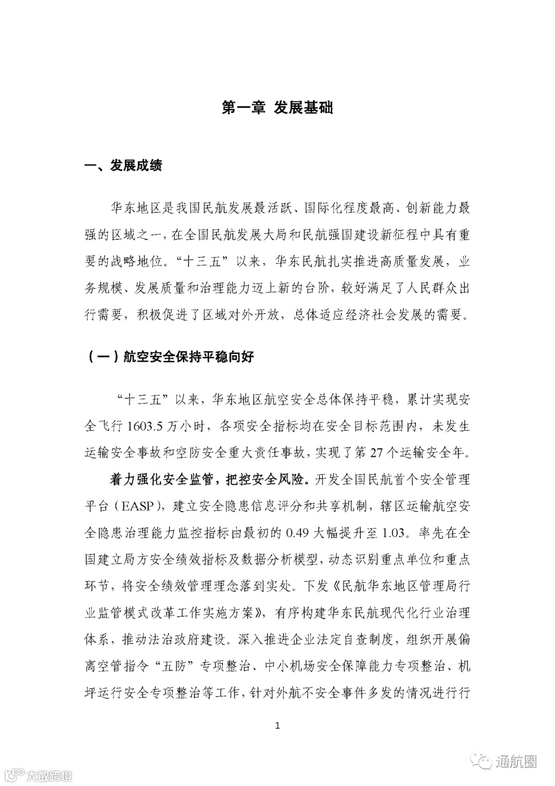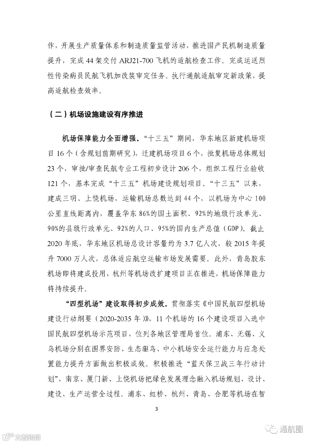 据介绍,十三五时期,华东地区通用航空业务量稳步提升。2020 年,华东地区通用航空完成飞 行13.6 万小时,起降41.2 万架次,“十三五”年均增速分别达到16% 和18%。消费类新业态发展较好,“十三五”时期共有4 个国家通用 航空旅游示范工程,6 个国家航空飞行营地示范工程获批。浙江、江 西、山东短途运输业务蓬勃发展,先后开辟“江西快线”、“环鲁飞” 等10 条定期短途运输线路。通航保障能力进一步增强。截至2020 年底,华东地区建成A 类 通用机场36 个、B 类通用机场41 个,A 类机场数量在全国位居前列, 通用航空器508 架、飞行员869 人。运输机场保障通航服务能力增强, 日照机场成为全国运输航空和通用航空发展融合的先行示范机场。低 空飞行服务保障能力显著提升,航行新技术推广应用成效明显,积极 推进北斗、ADS-B、远程塔台等技术在通用航空运行领域的应用。通航改革试点取得显著成效。出台《民航华东地区促进通用航空发展重点工作措施》,进一步加强顶层设计。搭建通航管理服务平台, 成立华东通航服务中心,启动政务服务中心,自主开发15 项“飞易” 系列公益、延伸服务产品,推动人才共享,通航服务供给进一步丰富。无人机试点工作起到良好示范作用,上海青浦和金山无人机试飞基 地、江西南康无人机物流配送试点运行平稳,已形成可复制可推广的 经验成果,无人机运行风险评估(SORA)试运行工作顺利开展,南 京等6 地成功申报首批民用无人驾驶航空试验基地。浙江省军民融合 低空空域改革试点取得重要进展。
