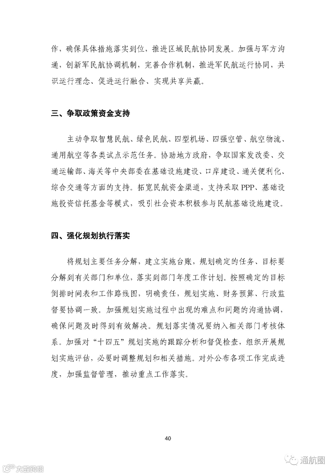 为了实现上述宏伟目标,在争取政策资金支持上,将主动争取智慧民航、绿色民航、四型机场、四强空管、航空物流、通用航空等各类试点示范任务。协助地方政府,争取国家发改委、交通运输部、海关等中央部委在基础设施建设、口岸建设、通关便利化、综合交通等方面的支持。拓宽民航资金渠道,支持采取PPP、基础设施投资信托基金等模式,吸引社会资本积极参与民航基础设施建设。同时加强与地方政府协调,协调地方政府将机场总体规划纳入机场所在地城市和土地利 用总体规划,严格控制机场周边的开发建设,切实保护好机场净空、 电磁环境和生态环境。鼓励地方政府给予机场、基地航空公司相关政 策扶持,共克疫情难关,加快恢复发展。加强与各省市的沟通,建立 多部门联动合作机制,共同做好长三角民航协同发展战略规划实施工作,确保具体措施落实到位,推进区域民航协同发展。加强与军方沟 通,创新军民航协调机制,完善合作机制,推进军民航运行协同,共 识运行理念、促进运行融合、实现共享共赢。